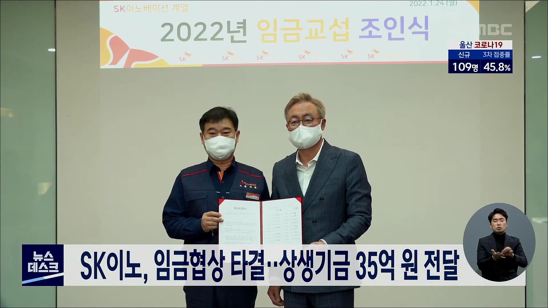 SK이노베이션 노사가 오늘(1/24) 울산CLS에서 ‘2022년도 임금교섭 조인식’을 열고 임금협상을 타결했습니다. 올해 SK이노베이션의 임금인상률은 전년도 소비자물가지수와 같은 2.5% 입니다. SK이노베이션 노사는 이번 조인식에서 71개 협력사 직원을 위한 상생기금 35억 7천만 원을 전달했습니다.