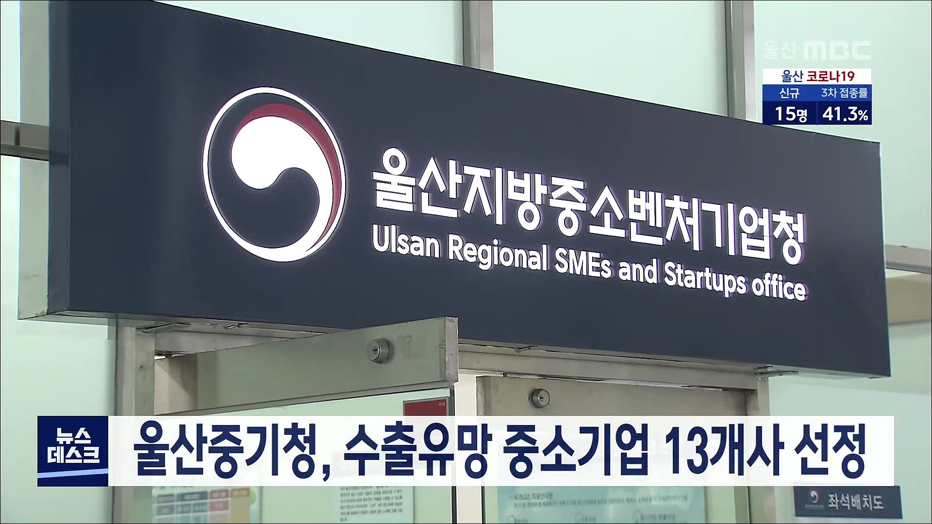 울산지방중소벤처기업청은 수출성장 가능성이 높은 주식회사 대도테크라 등 13개 중소기업을 올해 상반기 수출유망 중소기업으로 선정했다고 밝혔습니다. 이들 기업들은 앞으로 2년 동안 중소기업진흥공단과 한국무역투자진흥공사, 시중은행 등 20여개 수출 지원 유관기관을 통해 각종 우대를 받게 됩니다. 현재 울산 지역...