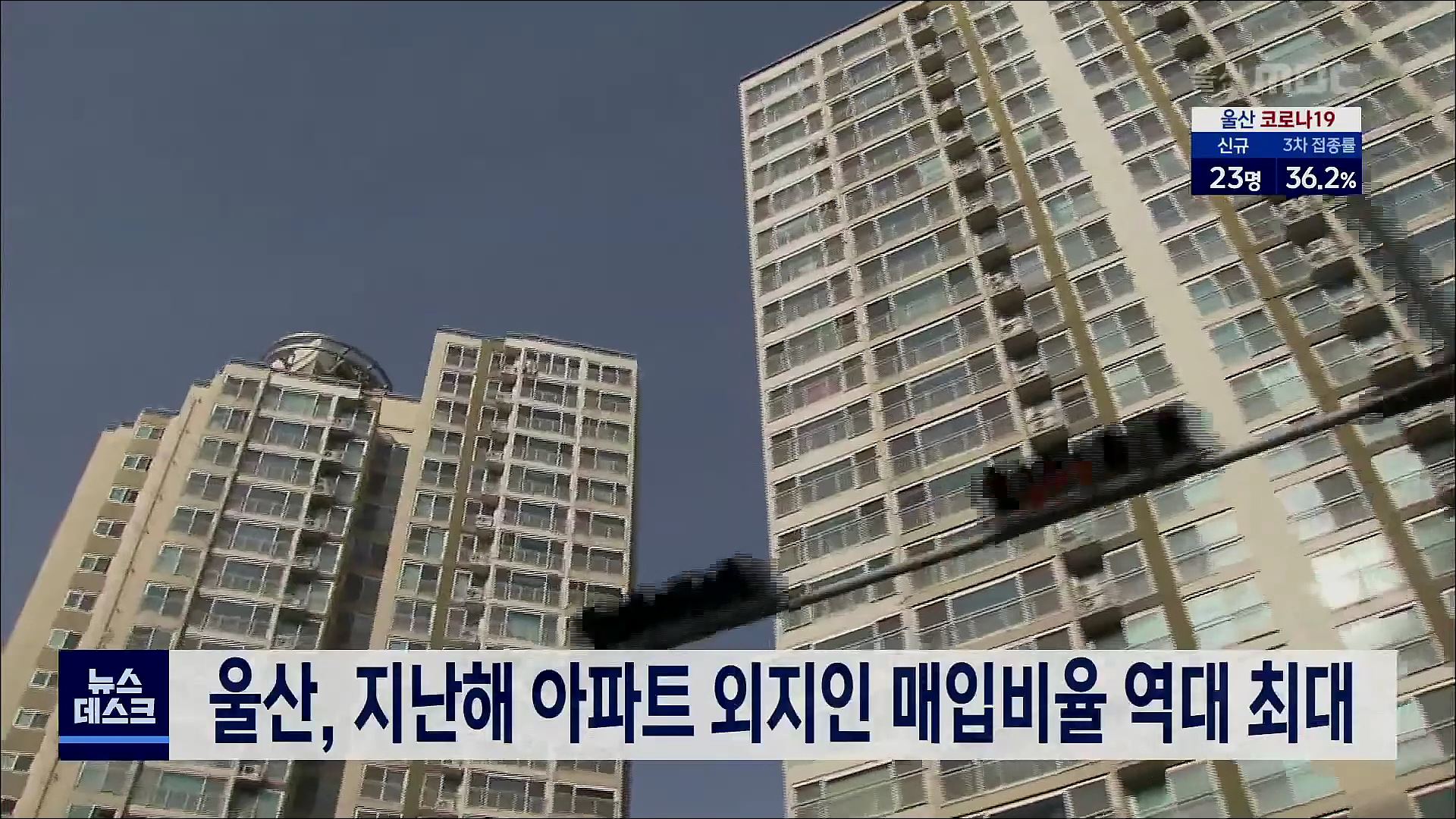 지난해 외지인이 울산지역 아파트를 사들인 비율이 역대 최대치를 기록했습니다. 한국부동산원에 따르면 지난해 11월까지 울산 아파트 매매거래 1만6천여 건 가운데 외지인 거래량은 3천 9백여 건으로 24.6%를 차지했습니다. 구·군별로는 동구가 31.1%로 가장 높았고, 남구 27.2%, 북구 23.4% 등의 순을 보였습니다. 지역 ...
