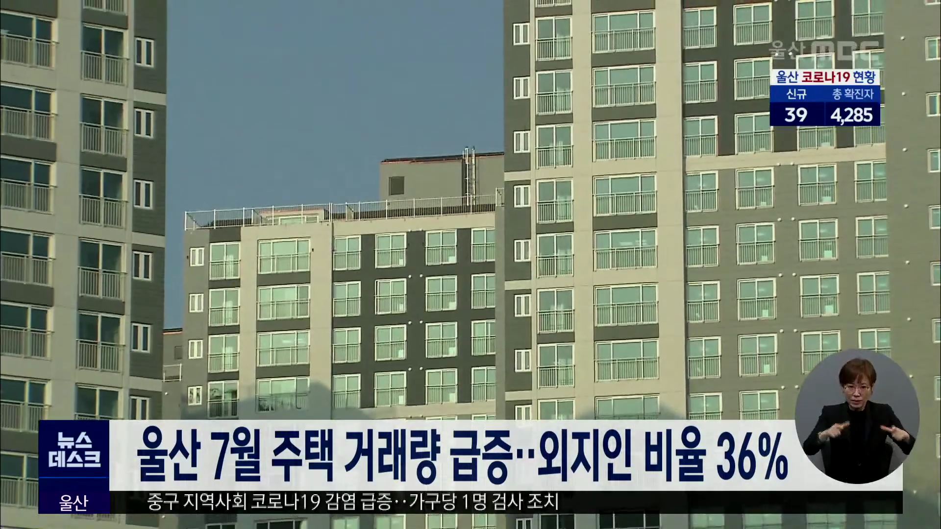울산지역 주택매매 거래량이 급증하고 있는 가운데 외지인 거래비율이 전국에서 가장 높은 것으로 나타났습니다. 국토교통부에 따르면 7월 울산지역 주택매매 거래량은 모두 2천 504건으로, 전달 대비 17.4% 늘어났으며, 전국 17개 시·도 가운데 증가폭이 가장 컸습니다. 특히 전체 주택 매매건수 가운데 36.1%인 904건이 ...