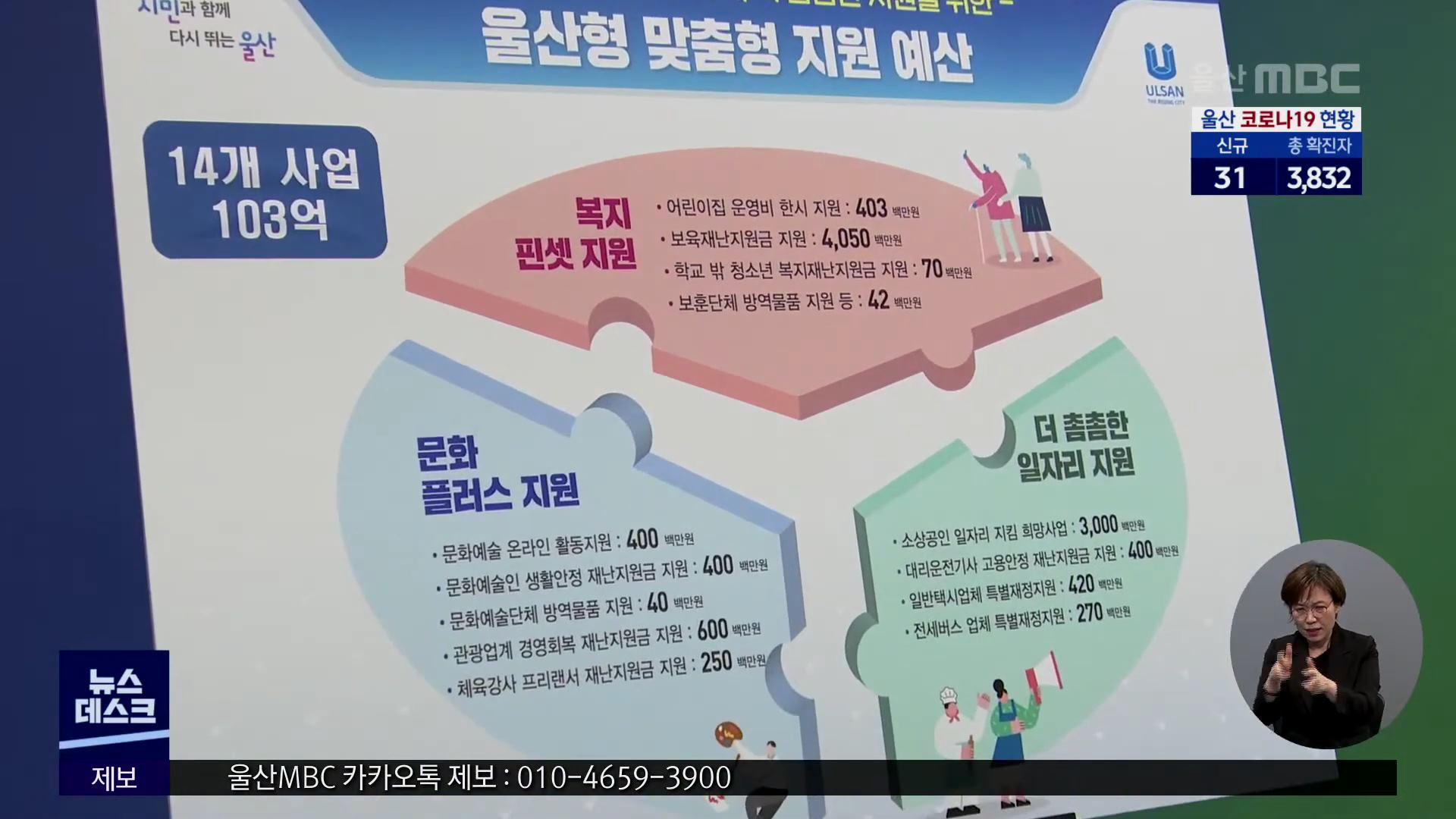 코로나19 장기화로 어려움을 겪고 있는 취약계층과 소상공인을 위해 울산형 위기극복 지원 사업이 추진됩니다. 예산 103억 원이 투입된 이번 사업은 보육 지원 등 내용을 담은 복지 분야와 공연이 줄어든 예술인을 위한 문화 분야 등 3개 분야 14개 사업으로 구성되며 오는 9월부터 시행될 예정입니다. //