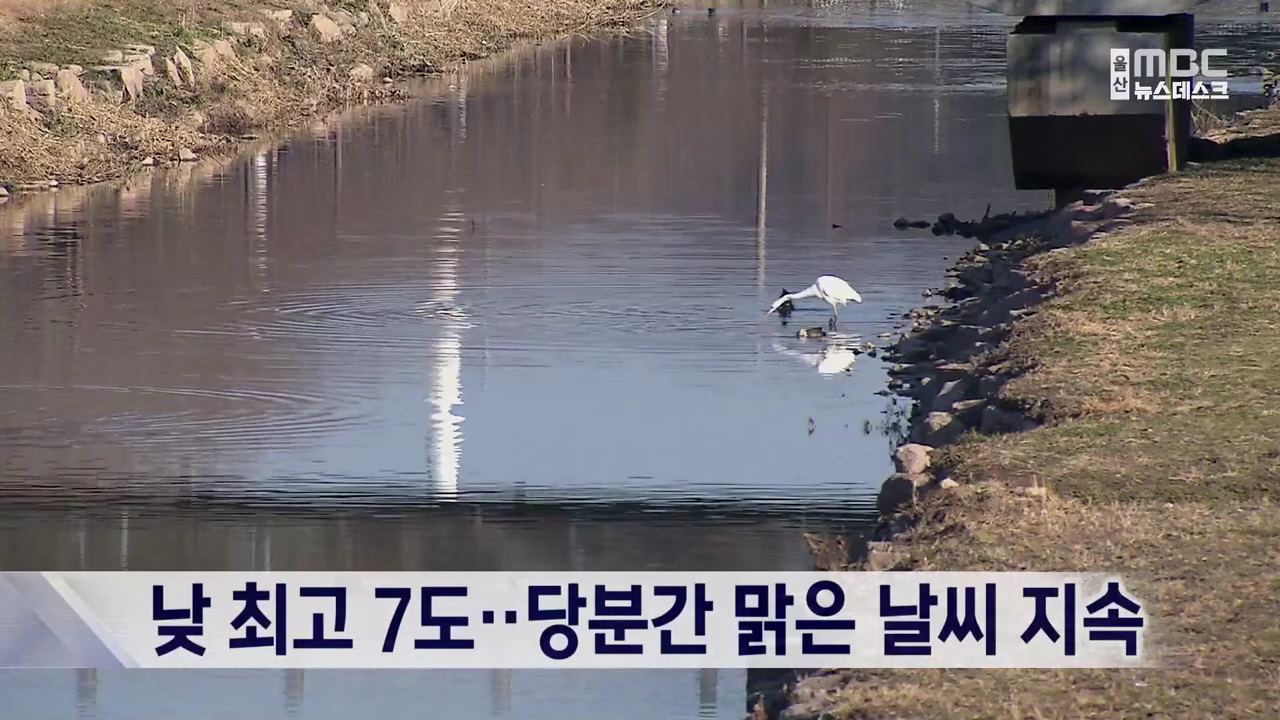 주말인 오늘(1/13) 울산지방은 대체로 맑은 가운데 낮 최고 기온은 7도를 기록했습니다.휴일인 내일(1/14)도 맑겠으며 기온은 3도에서 15도의 분포로 오늘보다 포근한 날씨가 예상됩니다.기상대는 당분간 비 소식 없는 맑은 날씨가 이어지다 다음주 목요일쯤 한차례 비가 내릴 것으로 내다봤습니다.
