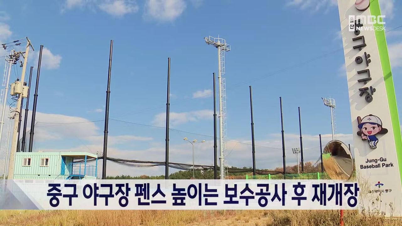 울산 중구 야구장이 안전 펜스를 높이는 보수 공사를 마치고지난 11일부터 재개장했습니다. 중구야구장은 지난 2022년 전국체전 당시 파울 공이 야구장 밖으로 날아가 차량을 파손 시키는 등 낮은 펜스로 인해 사고가 잇따라 발생하자 안전 펜스 높이를 15m에서 20m까지 높이는 공사를 시행했습니다.하지만 안전 펜스를 높...