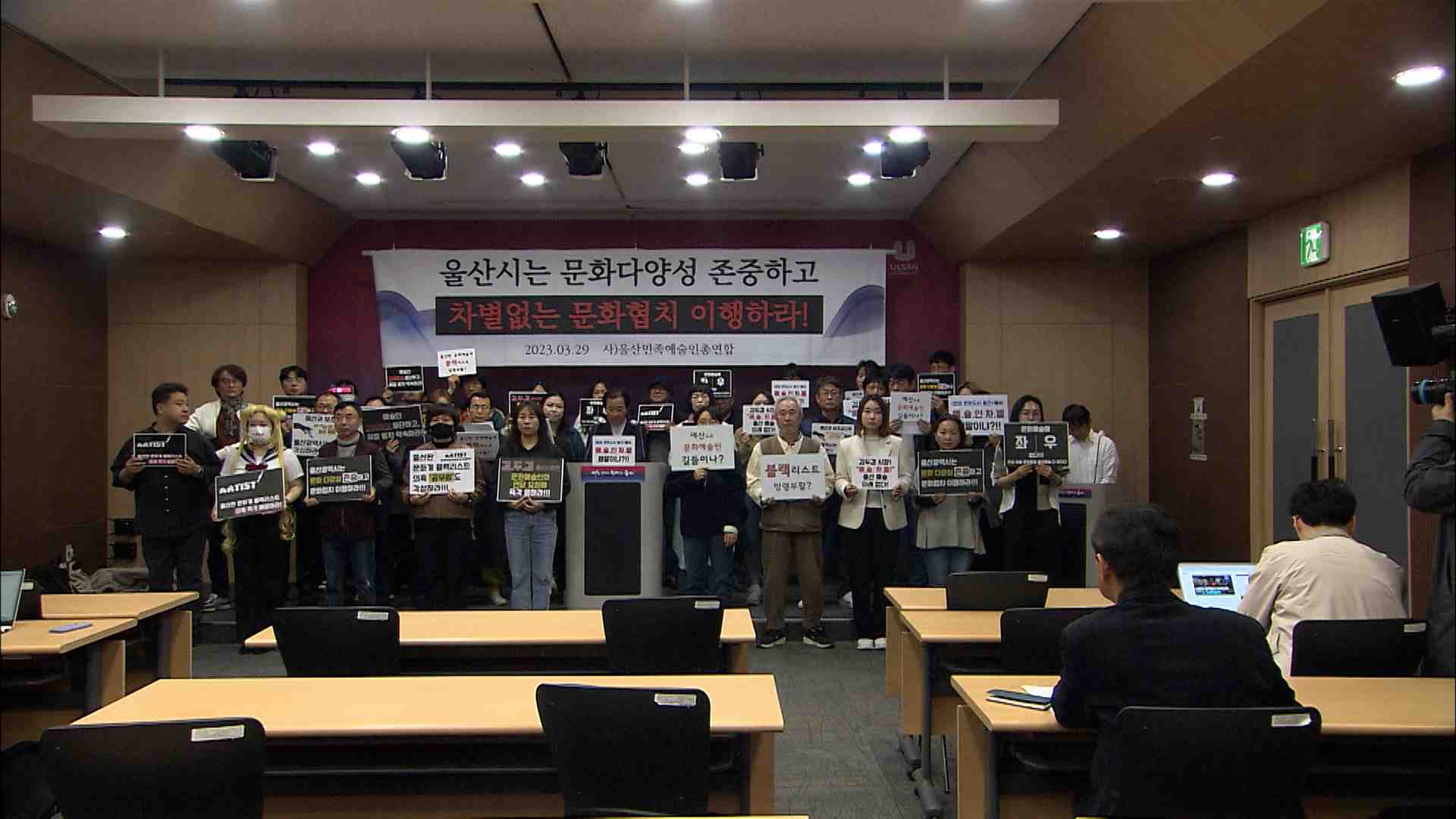 울산민족예술인총연합이 오늘(3/29) 울산시청 프레스센터에서 기자회견을 열고 울산시가 문화예술계를 차별하고 있다며 블랙리스트 의혹을 제기했습니다. 이들은 울산시가 올해 민예총 관련 당초예산을 절반으로 줄이고, 지난해 공모사업에 선정됐던 산하 5개 단체를 올 상반기에 전부 탈락시키고도 이유를 밝히지 않고, 어...