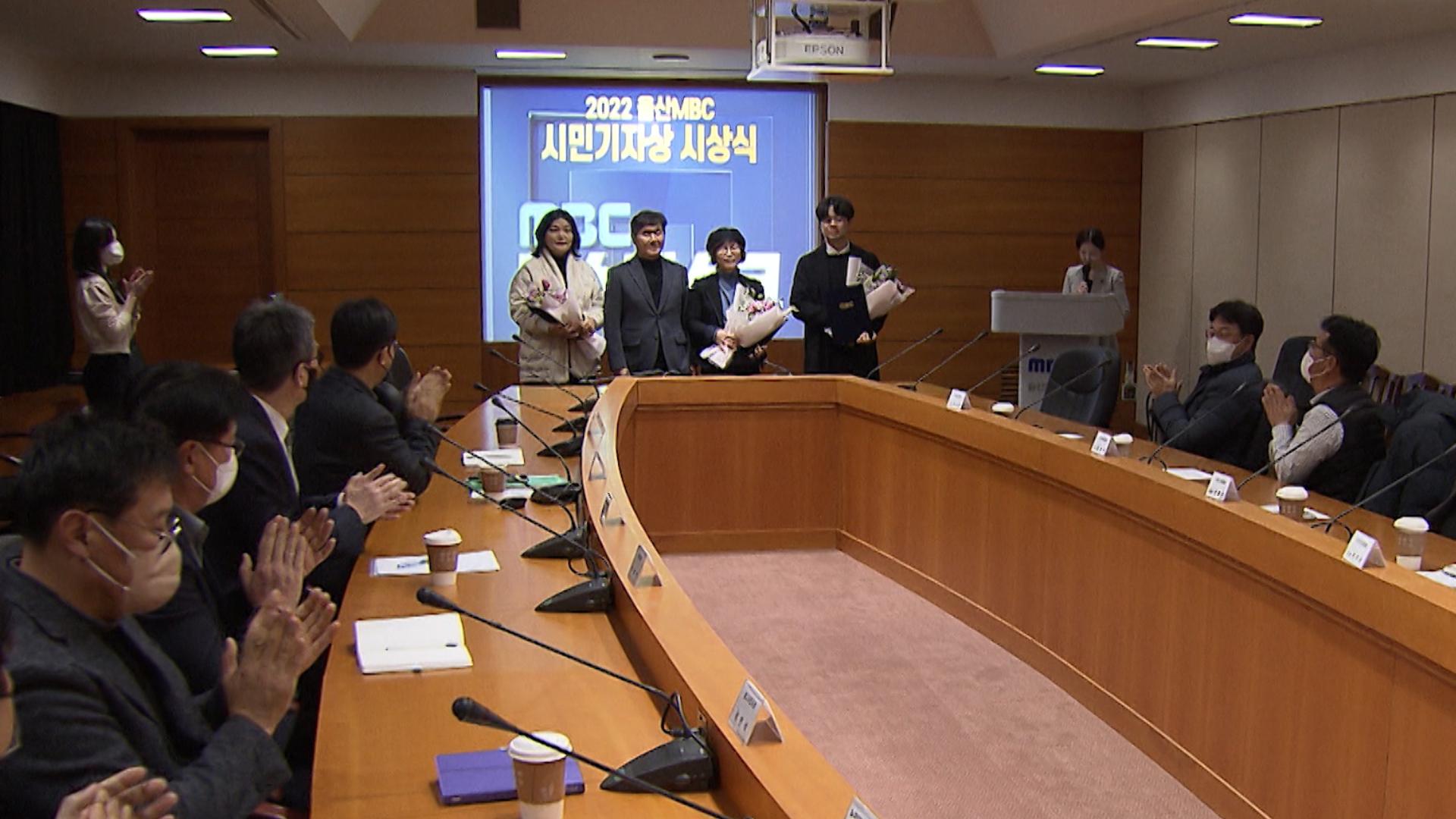 울산MBC 시청자위원회가 오늘(12/20) 12월 정기회의를 개최해 프로그램 평가와 함께 울산MBC-울산시청자미디어센터 공동기획 우리 동네 시민뉴스 시상식을 열었습니다. 이 자리에서 김삼숙 시민기자가 최우수상을, 서선숙 권익만 시민기자가 우수상을 받았고, 임기가 끝난 안종준 시청자위원장에 대한 감사패 전달이 이어졌...