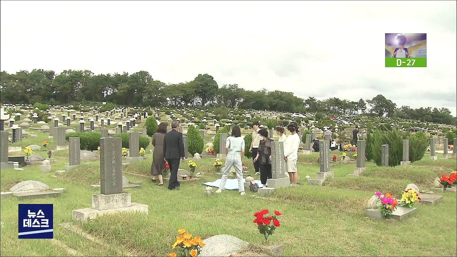 추석인 오늘(9/10) 울산 공원묘지는 오전 일찍부터 조상님의 묘소를 찾는 발길이 이어졌습니다. 시민들은 정성껏 싸온 음식을 놓고 술잔을 치며 예를 갖춰 조상님에게 명절인사를 드렸습니다. 울산대공원에는 민속놀이 체험장이 마련돼 방문객들은 투호던지기와 제기차기 등을 하며 즐거운 한때를 보냈습니다.[김지민-박선...