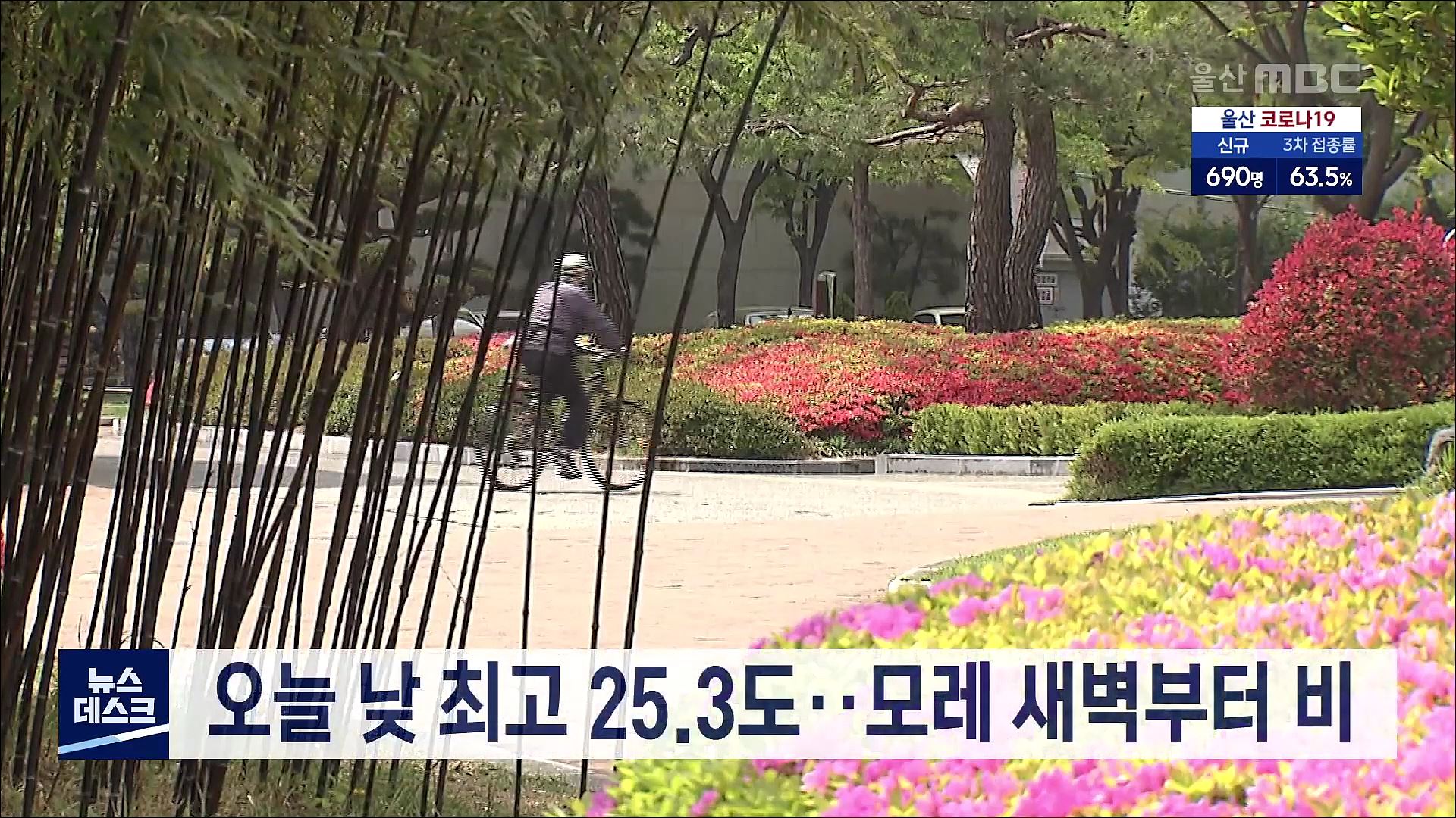 오늘(4/24) 울산지방은 대체로 맑은 가운데 낮 최고 기온이 25.3도까지 올라 한낮에는 초여름 날씨를 보였습니다. 또 오늘 낮 한때 남구 등 일부지역에 오존주의보가 발령됐습니다. 울산지방은 내일도 낮 최고 기온이 26도까지 오르겠으며, 모레 새벽부터 오후까지 비가 내릴 것으로 전망됩니다.//