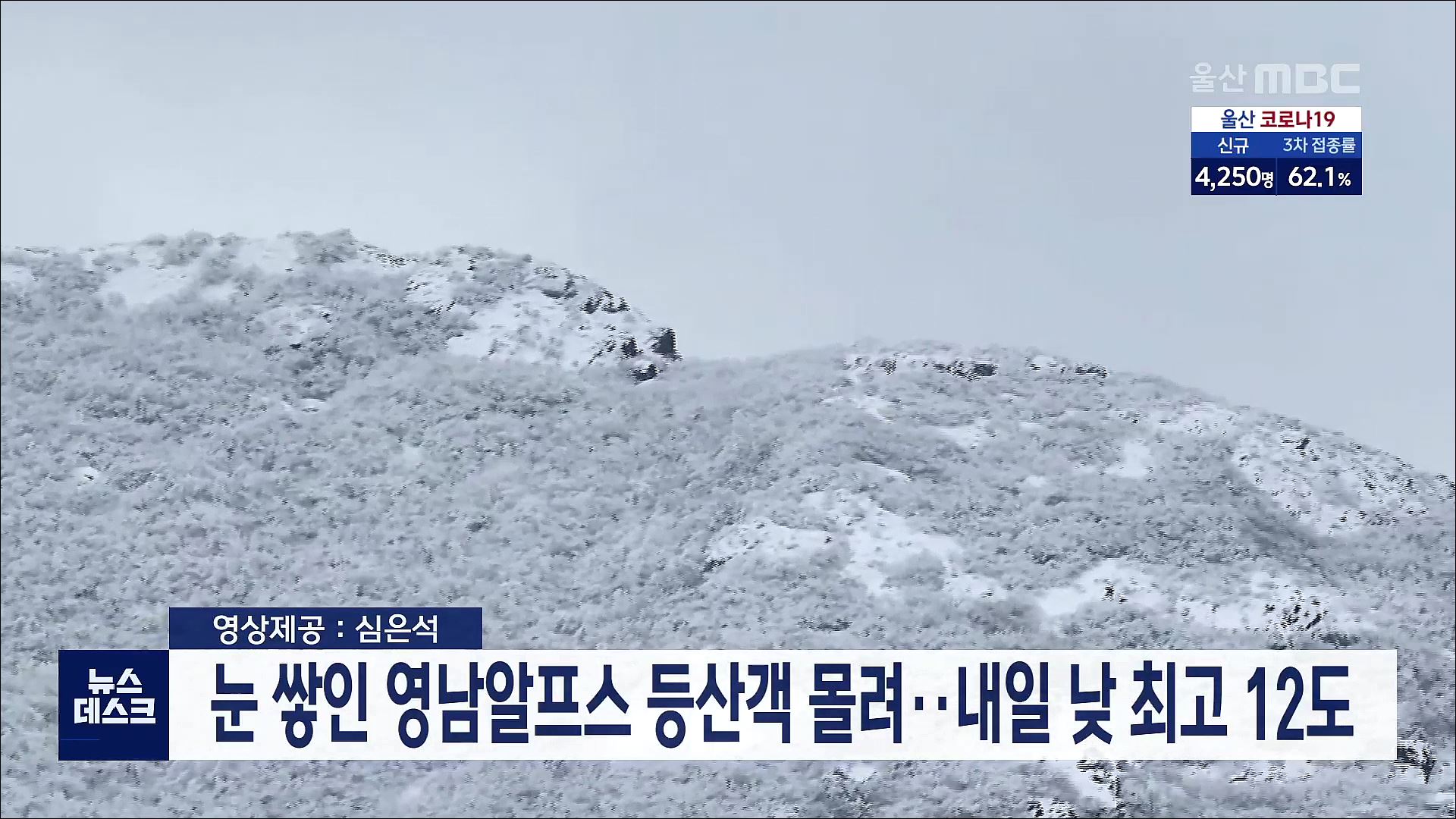 울산 산악지역에 봄을 시샘하는 눈이 내려 눈꽃 산행을 즐기려는 등산객들이 몰렸습니다. 울주군은 어제(3/19) 새벽 가지산와 천왕산 등 영남알프스 일대에 눈이 내렸고 꽃샘추위로 인해 산 정상 부근의 눈은 녹지 않았다고 설명했습니다. 군은 또, 등산객 안전을 위해 산악 도로에 쌓인 눈에 대한 제설 작업을 마쳤다고 설...
