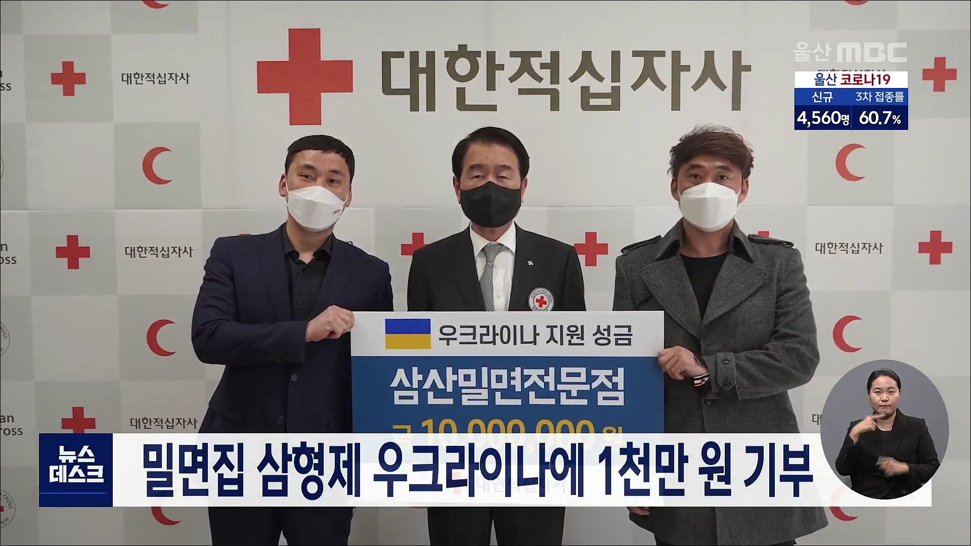 울산에 사는 한가족 삼형제가 우크라이나를 위해 1천만원을 기부해 화제입니다. 대한적십자사 울산지사는 남구에서 밀면집을 운영하는 삼형제가 오늘(3/7) 오후 우크라이나에 위로금 1천만 원을 전달했다고 밝혔습니다. 대한적십자사는 우크라이나 구호 활동을 위한 모금 캠페인을 지난 3일부터 진행하고 있습니다.