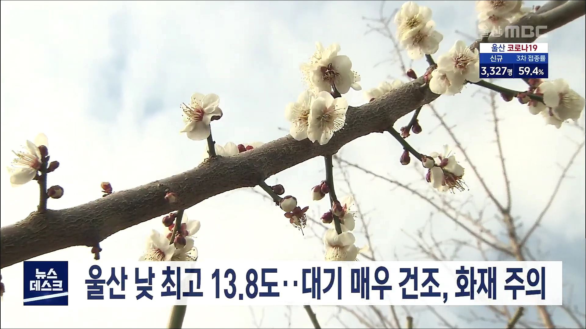 오늘(2/25) 울산지방은 대체로 맑은 가운데 낮 최고 기온이 11.6도를 기록해 추위가 누그러졌습니다. 주말인 내일은 아침 최저 영하 1도로 시작해 낮 최고 기온이 14도까지 올라 포근하겠습니다. 현재 울산에는 엿새째 건조경보가 내려진 가운데 내일까지 바람도 강하게 불 것으로 예상돼 화재 예방에 각별한 주의가 필요합...