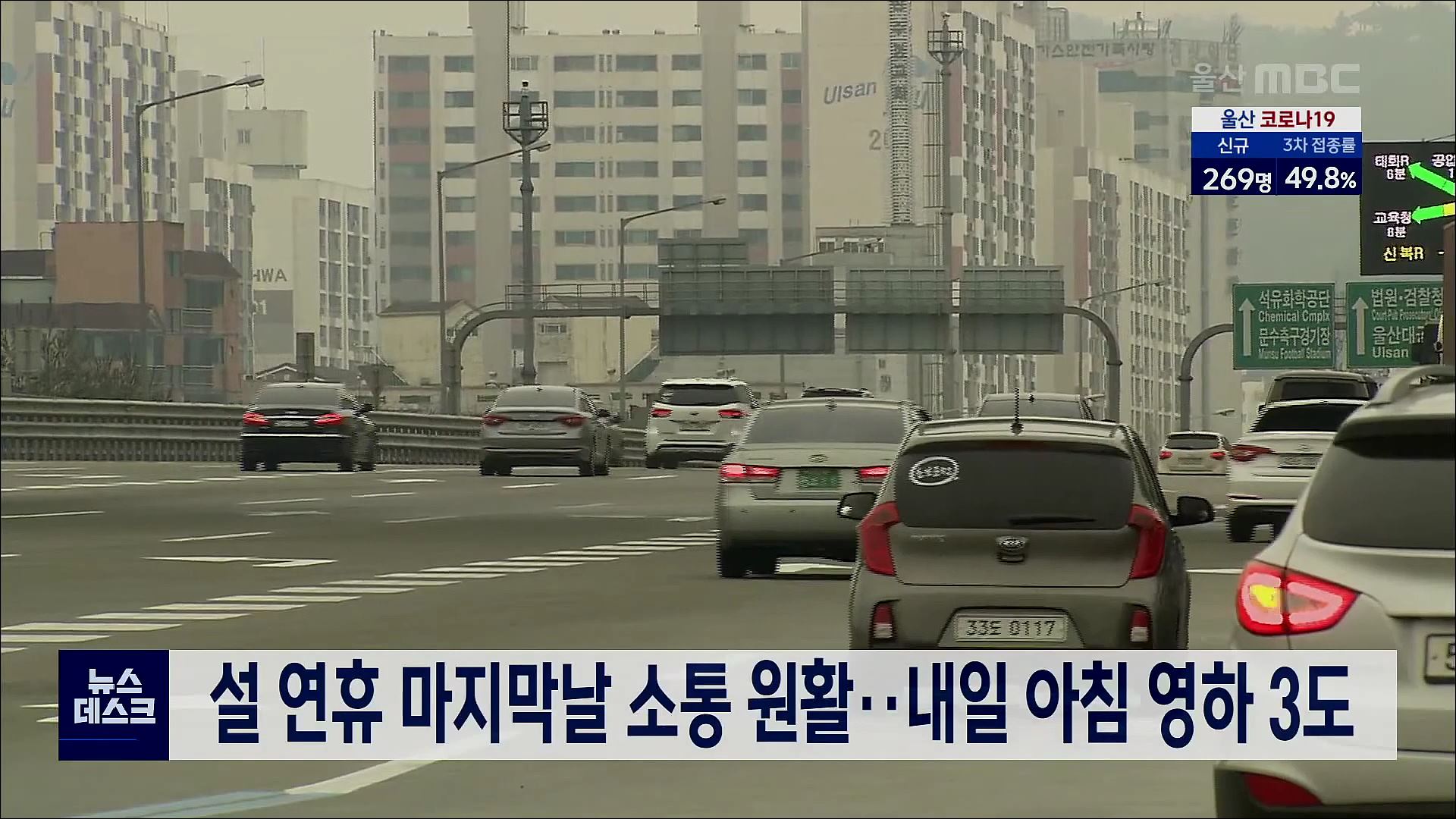 설 연휴 마지막날인 오늘(2/2) 울산지역 주요 도로는 대부분 원활한 교통 흐름을 보였습니다. 한편 6일째 건조 경보가 이어지고있는 울산지방은 오늘 한낮 최고 기온이 5.1도를 기록하였습니다. 내일은 가끔 구름 많겠고 아침 영하 3도 낮 최고 7도의 일교차 큰 날씨가 예상되니 건강관리에 각별한 주의가 필요합니다.
