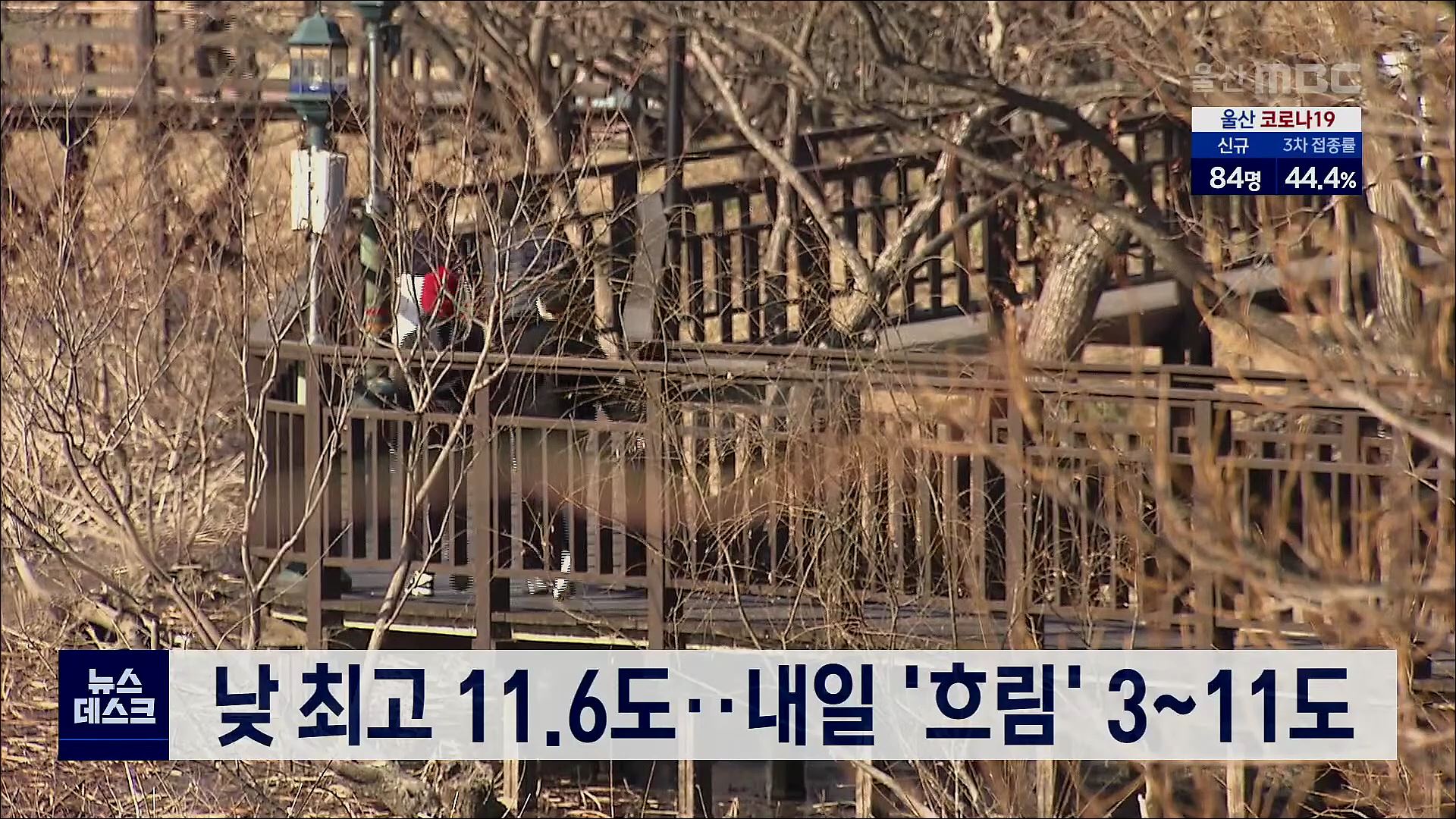 오늘(1/26) 울산지방은 대체로 맑은 가운데 낮 최고 기온이 11도로 어제보다 2도 가량 높아 비교적 포근하겠습니다. 미세먼지 농도는 보통 수준으로 야외활동 하기에 무난하겠습니다. 내일은 아침 기온이 영하1도까지 떨어지겠지만 한낮의 기온은 10도까지 올라 일교차가 크게 벌어지겠습니다.