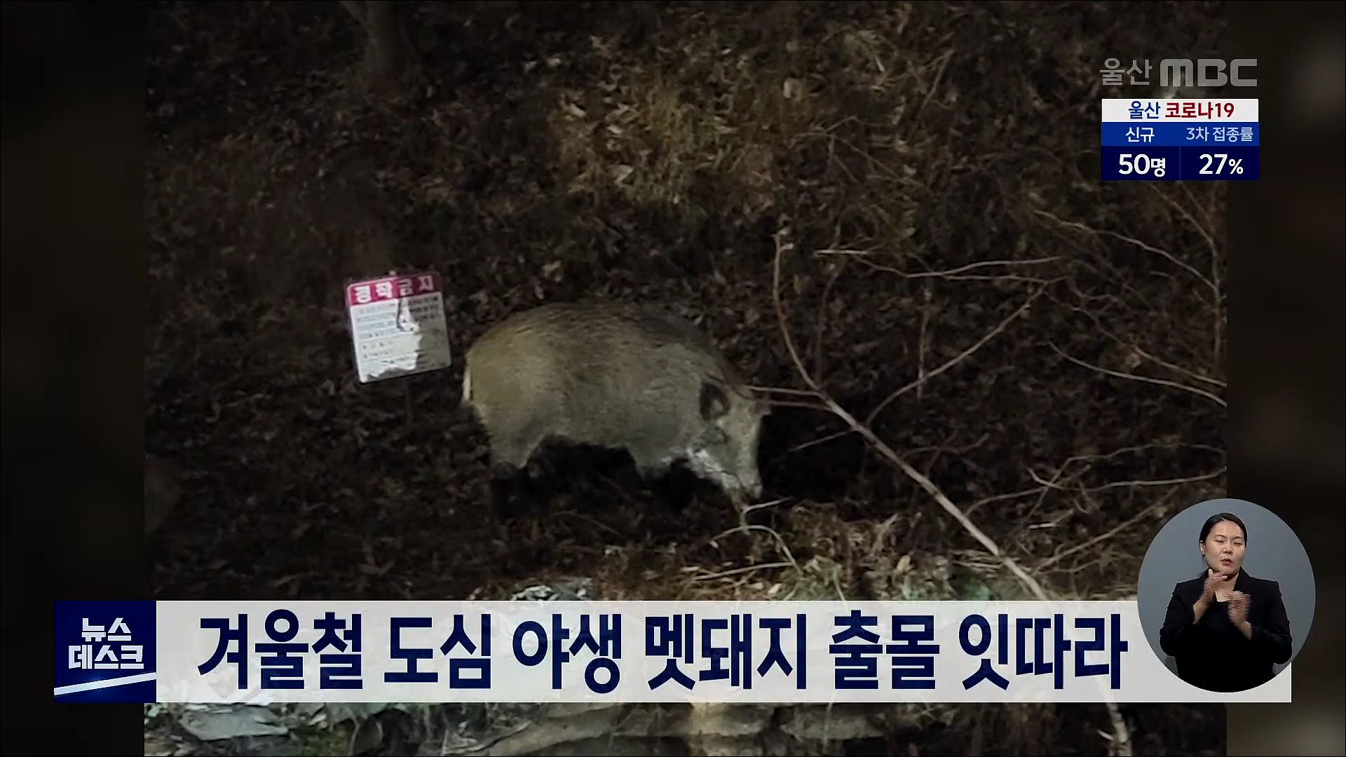 어젯(12/27)밤 북구 염포동의 한 아파트 뒷산에 멧돼지가 나타나 주민 신고가 잇따랐습니다. 울산에서는 지난 17일 남구 무거동 야산에서, 지난 10월에는 중구의 한 아파트 지하주차장에서 멧돼지가 나타나는 등 겨울철 먹이가 부족한 멧돼지의 도심 출몰이 잇따르고 있습니다.