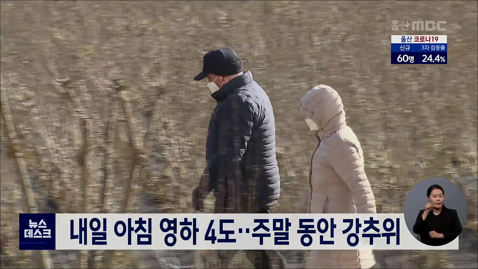 오늘(12/24) 울산지방은 구름 많은 가운데 낮 최고 기온 10.9도를 기록했습니다. 오늘 밤부터 북서쪽에서 찬 공기가 남하면서 성탄절인 내일은 아침 최저 영하 4도, 낮 최고 영상 1도로 기온이 뚝 떨어지겠고, 바람도 강하게 불겠습니다. 특히 일요일에는 아침 기온이 영하 9도까지 떨어져 올 겨울 들어 가장 추운 날씨를 ...