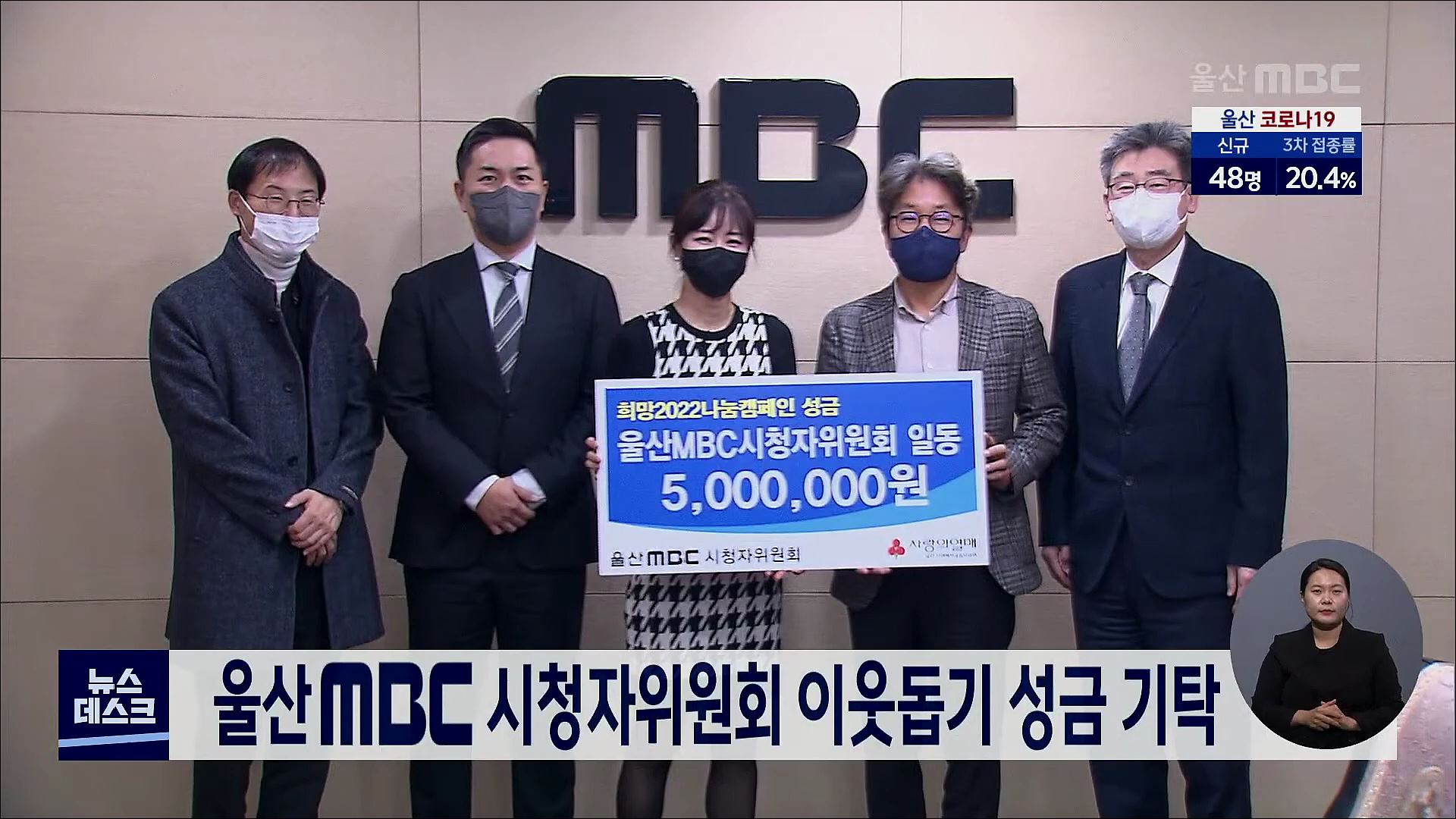 울산MBC 시청자위원회가 오늘(12/21) 울산MBC를 방문해 이웃 돕기 성금 500만원을 기탁했습니다. 시청자위원회 성금은 위원들이 회의비를 모아 마련됐으며, 사회복지공동모금회를 통해 지역의 어려운 이웃들을 돕는데 쓰여질 예정입니다. 한편 울산MBC는 임기가 끝난 위원들에게 감사패를 전달했습니다.