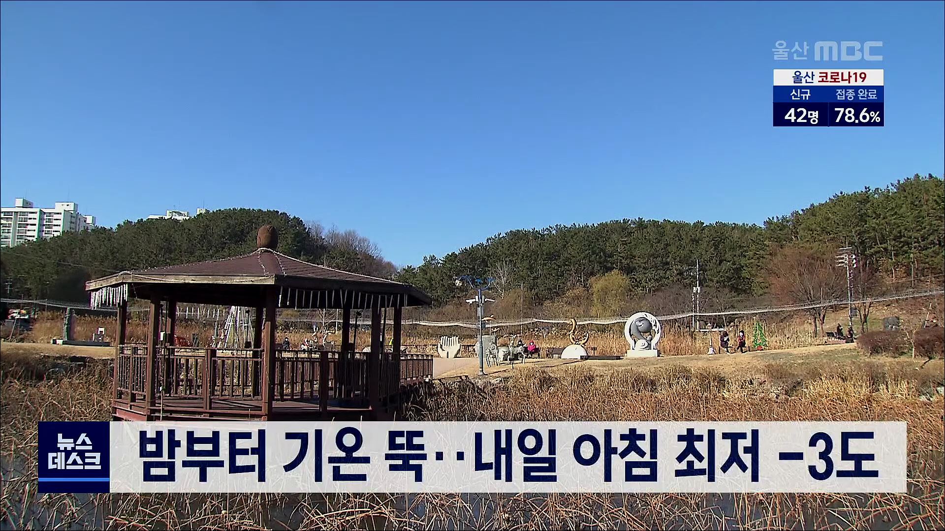휴일인 오늘(12/12) 울산지방은 대체로 맑은 가운데 낮 최고 기온은 11.6도를 기록했습니다. 오늘 밤부터 기온이 뚝 떨어져 내일(12/13)은 아침 최저 영하 3도에서 낮 최고 7도의 분포를 보이겠습니다. 기상대는 맑은 날씨 속 아침 영하권 날씨가 이어지다 오는 목요일쯤 한차례 비가 내릴 것으로 내다봤습니다.