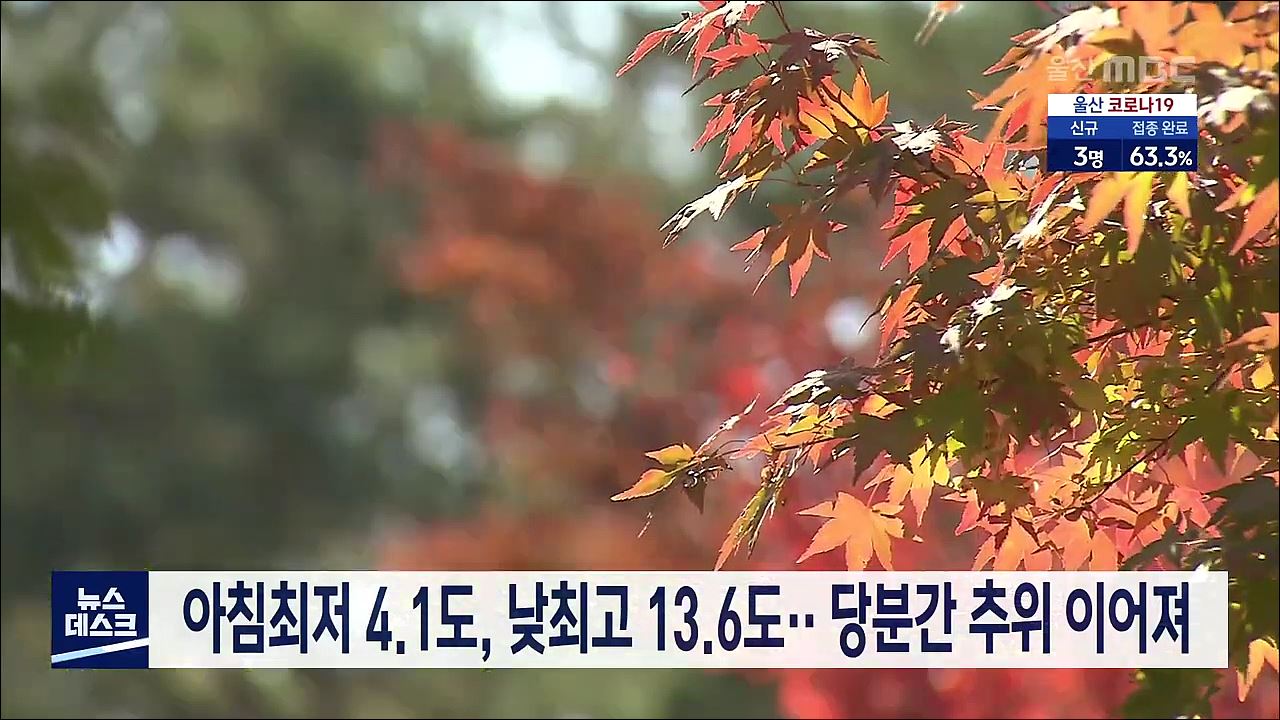 오늘(10/17) 울산지방은 아침최저 기온이 4.1도까지 떨어지며 때이른 추위가 기승을 부렸습니다. 한낮기온도 어제보다 7도 정도 낮은 13.6도에 머물면서, 번화가 등에는 평소보다 시민들의 발길이 줄어들었습니다. 울산지방은 내일도 아침 최저 5도, 낮 최고 18도로 평년보다 기온이 크게 낮겠고 이번 추위는 주 중반 이후...