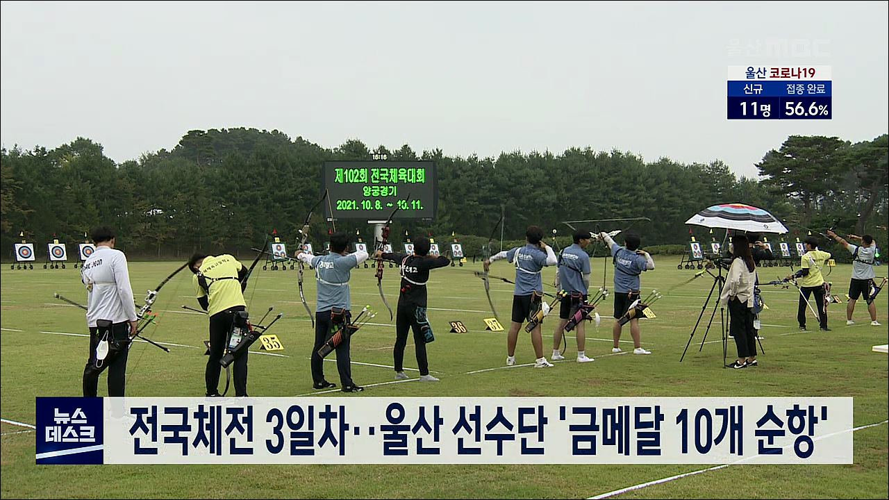 경북 구미에서 열리는 제102회 전국체전에서 울산 선수단이 선전하고 있습니다. 울산은 경기 3일차인 오늘(10/10) 양궁과 사격에서 금메달 2개를 획득하는 등 모두 9개의 메달을 추가했습니다. 이로써 울산은 금메달 10개와 은메달 7개, 동메달 9개를 확보했습니다.