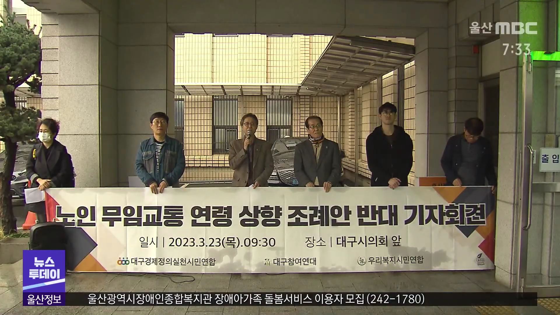 [앵커] 올해 7월부터 대구지역 75세 이상 어르신들은 시내버스를 무료로 이용할 수 있습니다. 도시철도 무료 이용 나이는 올해 65세부터 시작해 내년부터 해마다 상향 조정되는데요, 시민단체의 거센 반발을 사고 있습니다. 보도에 김철우 기자입니다. [리포트] 대구경실련, 대구참여연대, 우리복지시민연합 등 시민단체 회...