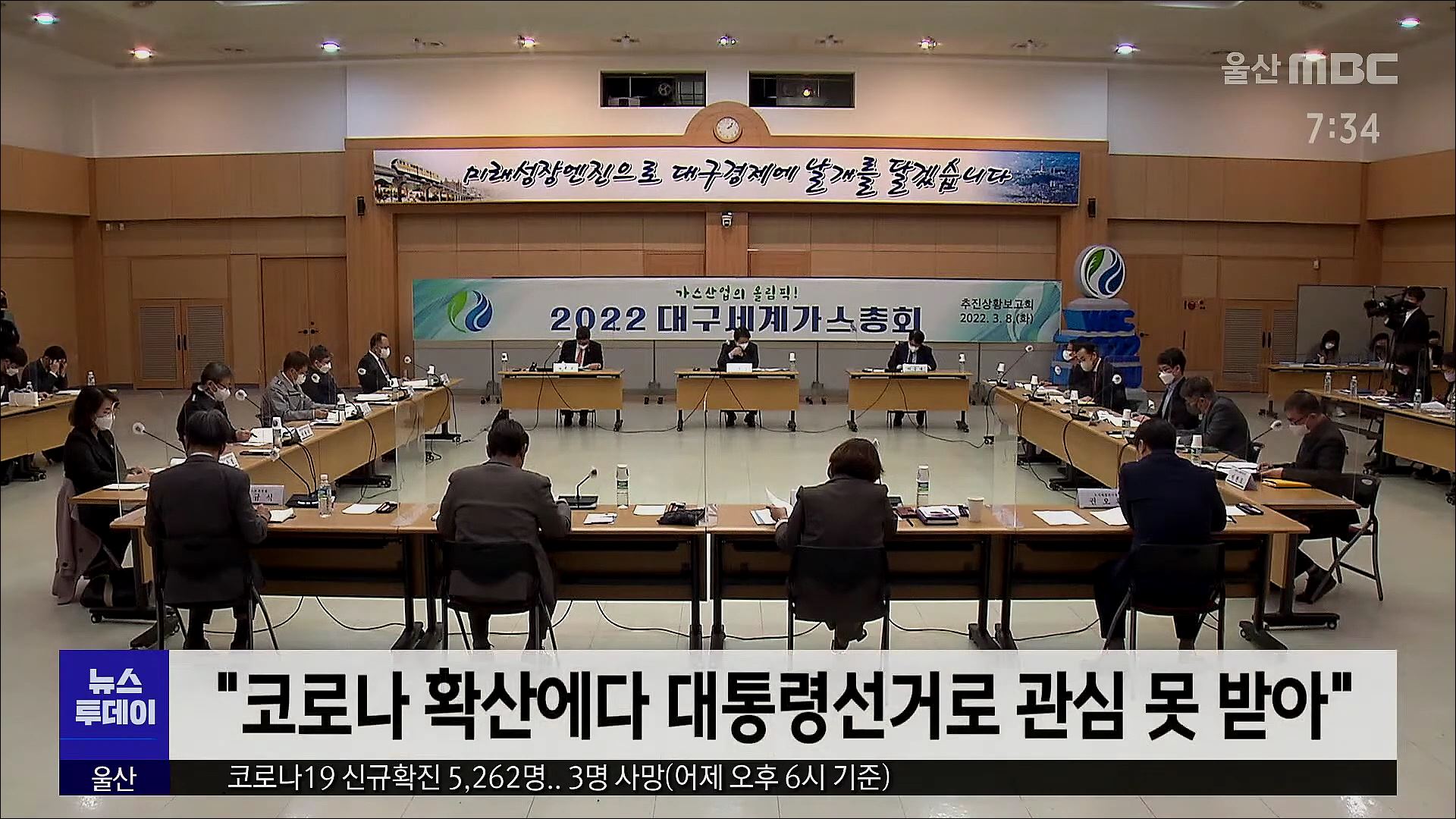 ◀ANC▶ 대구시가 공을 들여 온 2022 세계가스총회가 정상적으로 개최될지 우려가 커지고 있습니다. 오는 5월 100% 대면으로 대구에서 열릴 예정이었는데, 코로나19 확산과 우크라이나 사태로 빨간불이 켜진 건데요, 입국자들의 편리한 수속을 위해 정부로부터 코로나 격리 면제 혜택까지 따냈지만 기대했던 규모로 개최할...