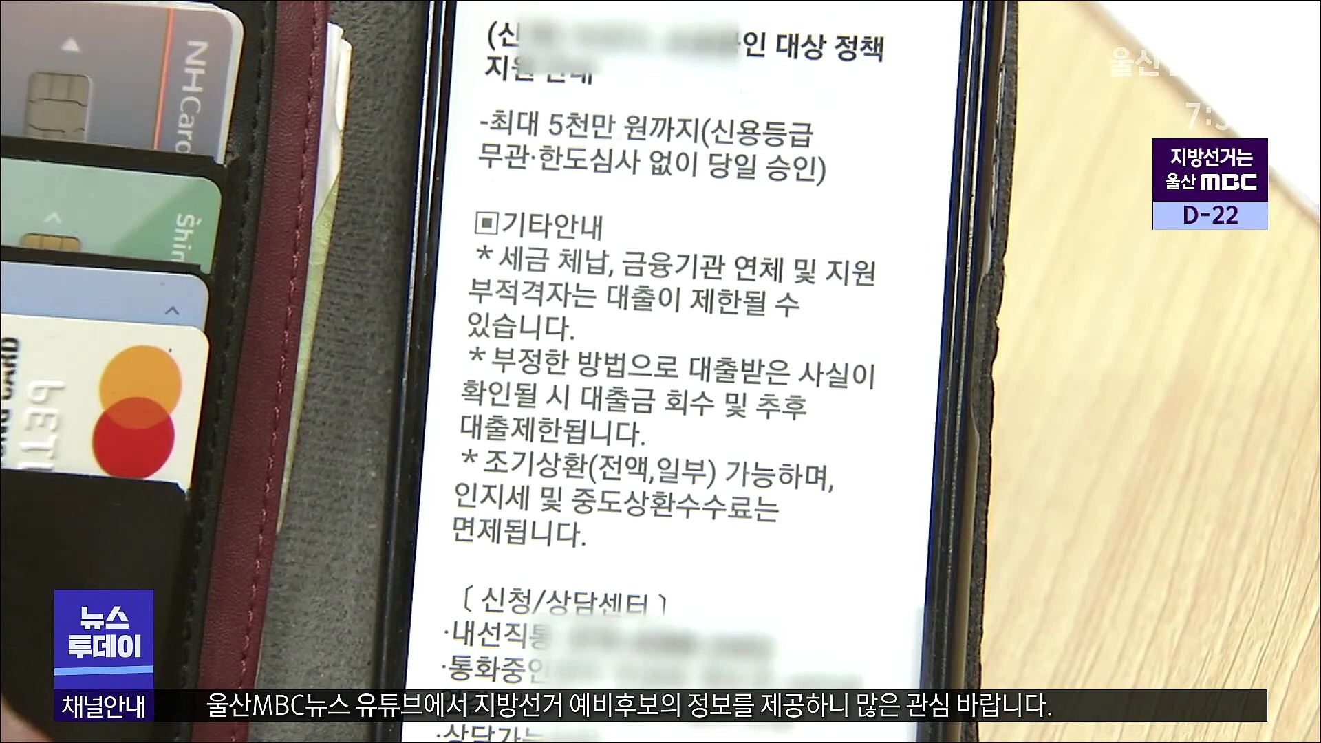 앵커|국가기관과 은행이 합동으로 저금리 대출 상품을 출시했다는 문자 받아본 적 있으십니까? 코로나19로 가뜩이나 어려운 소상공인들을 노려 정책자금 대출을 미끼로 돈을 받아 가로채는 범죄가 기승을 부리고 있습니다. 김영창 기자의 보돕니다. 리포트| 코로나19 장기화로 매출이 반토막 나면서 자영업자 남기민 씨는...