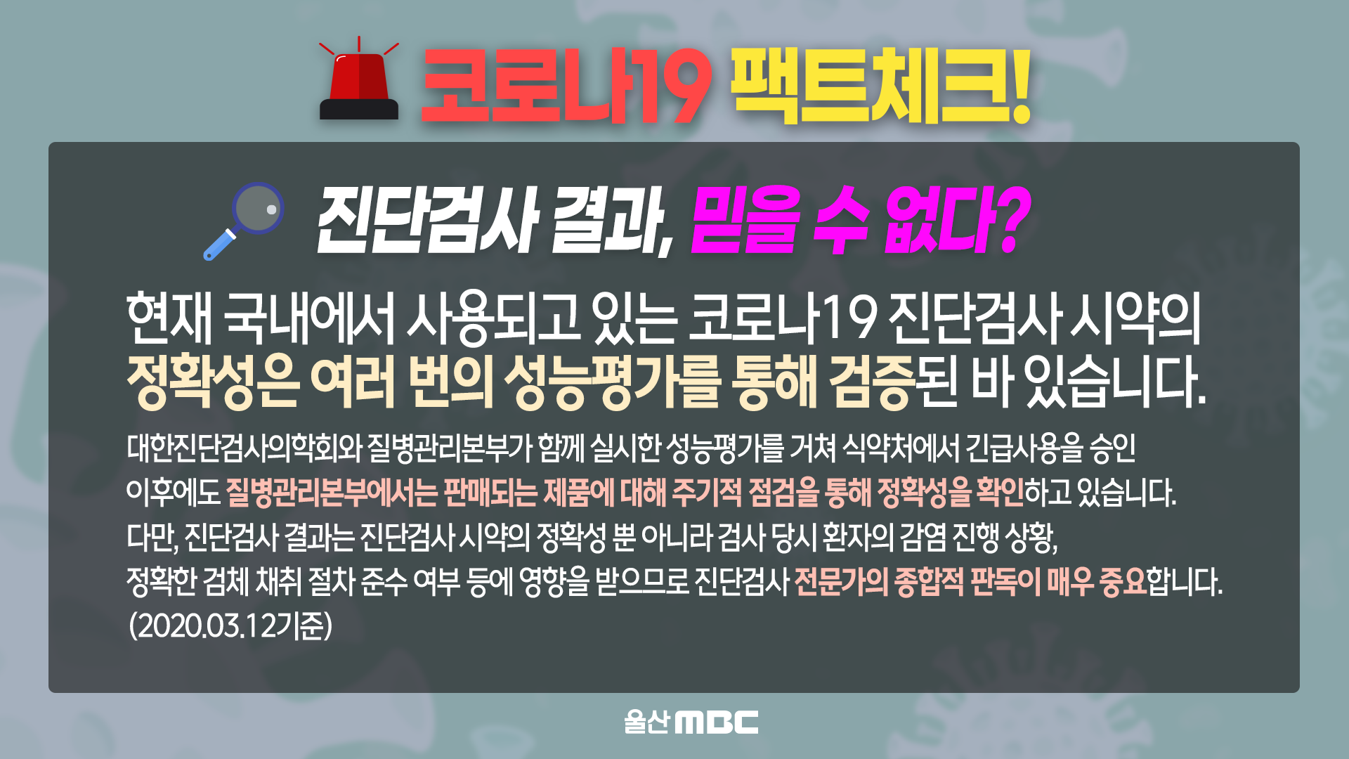 다만, 진단검사 결과는 진단검사 시약의 정확성 뿐 아니라 검사 당시 환자의 감염 진행 상황, 정확한 검체 채취 절차 준수 여부 등에 영향을 받으므로 진단검사 전문가의 종합적 판독이 매우 중요합니다.