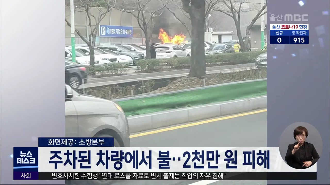 한 주차장에 주차된 차량에서 불이 나