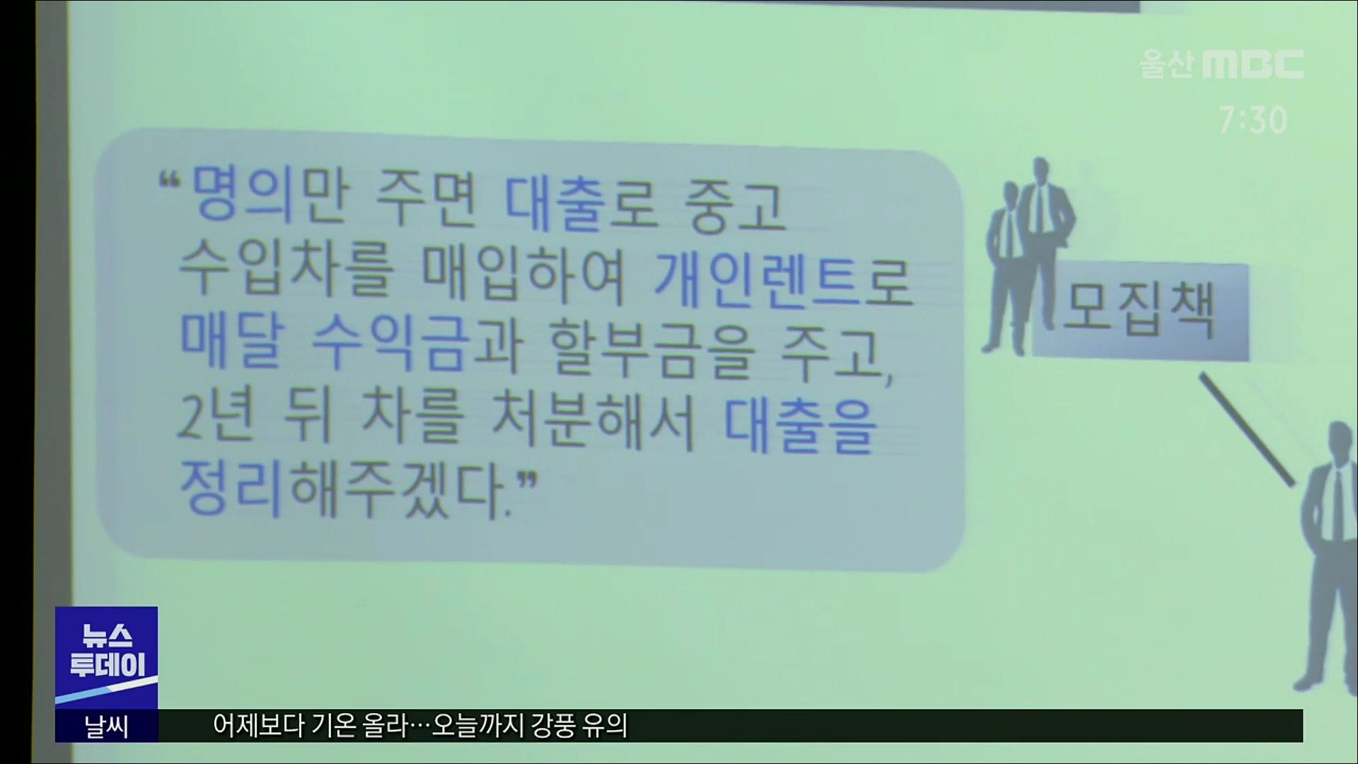 "자동차 자가용 유상 대여 행위는 불법 행위입니다. 투자를 하시더라도 허가 업체인지 유무를 꼼꼼히 살피고 투자를 하시길 바랍니다"
