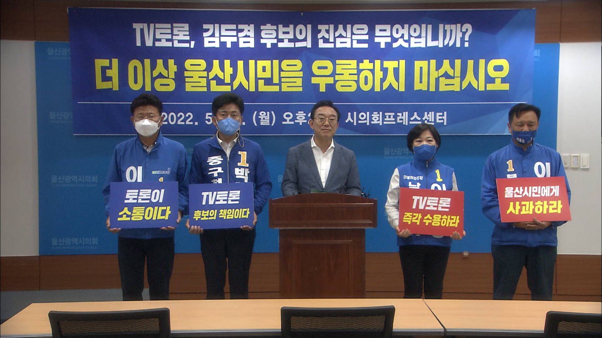 송철호 더불어민주당 울산시장 후보는 오늘(5/16) 울산시의회에서 기자회견을 열고 국민의힘 김두겸 후보가 TV토론을 거부하는 등 울산시민의 알권리를 무시하고 있다고 주장했습니다.