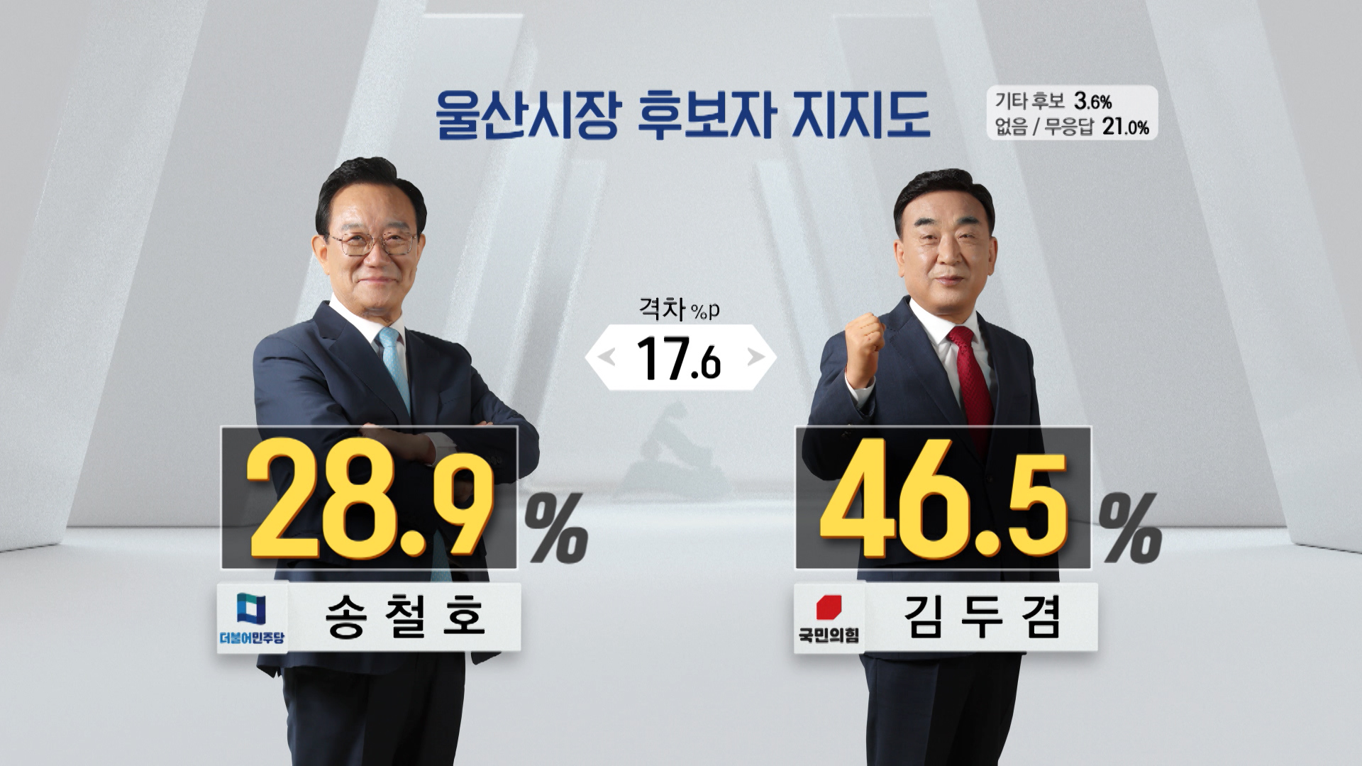 현재까지 울산시장 선거 후보는 더불어민주당 송철호 후보와 국민의힘 김두겸 후보 2명입니다. 이 두 후보를 대상으로 여론조사를 해 봤습니다. 민주당 송철호 후보가 28.9%, 국민의힘 김두겸 후보가 46.5%로 김두겸 후보가 앞서는 것으로 나타났습니다.