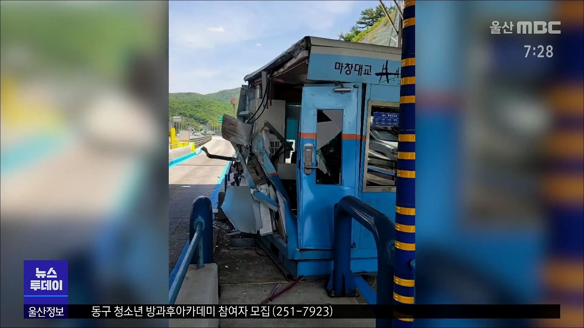 지난달 9일 낮, 25톤급 트레일러가 마창대교 요금소에서 일반 하이패스 차로로 진입하다 싣고 있던 철재물이 요금소를 충격했습니다.