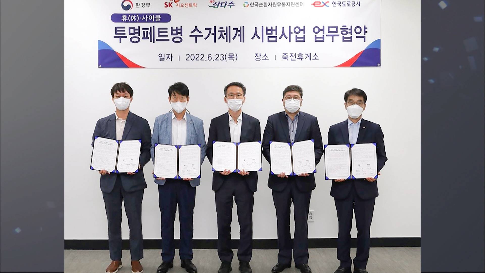 SK지오센트릭과 한국도로공사는 전국 휴게소 페트병 분리배출 프로그램인 '휴(休)-사이클' 캠페인을 위한 업무협약을 체결했다고 밝혔습니다.