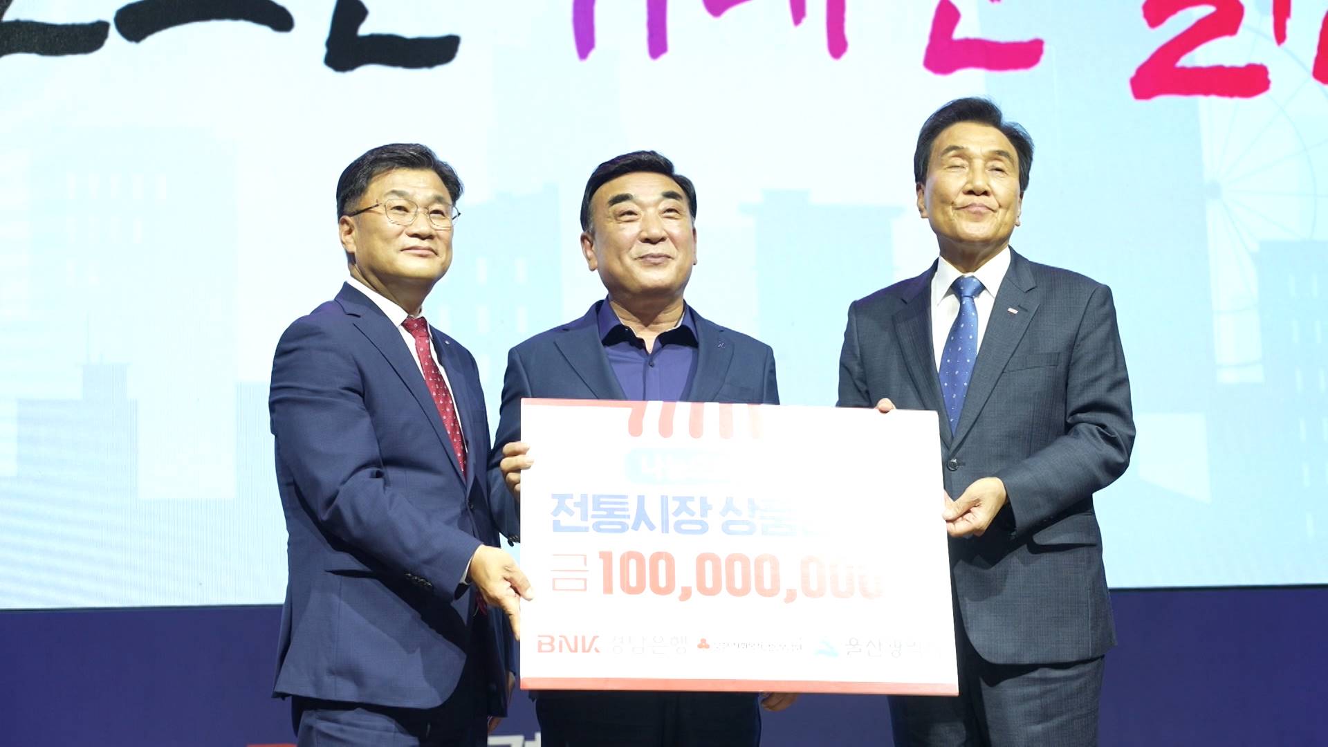 이어 울산시가 추천한 소외계층 1천명을 위해 써 달라며 성금 1억원을 기탁했으며, 은행 직원 3백여명이 신정시장과 중앙 전통시장을 찾아 지역경제 활성화 캠페인도 벌였습니다.
