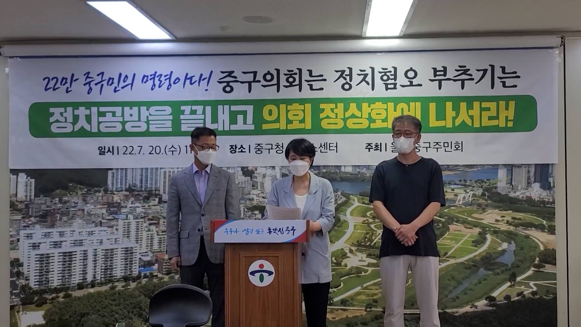 울산 중구 주민회가 오늘(7/20) 중구청 프레스센터에서 기자회견을 열고 중구의회 국민의힘과 민주당 양당 의원들의 정치 공방을 비판했습니다.