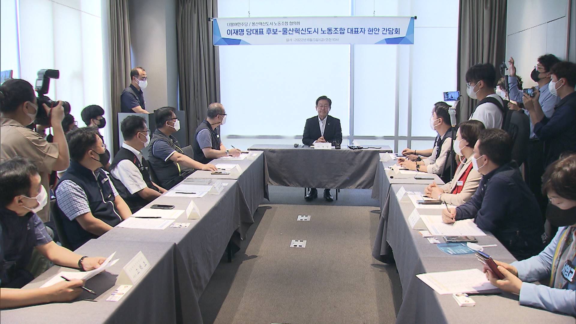 더불어민주당 이재명 당 대표 후보는 오늘(8/5) 울산 남구 신라스테이에서 울산혁신도시 9개 공공기관 노동조합 대표들과 만나 간담회를 가졌습니다.