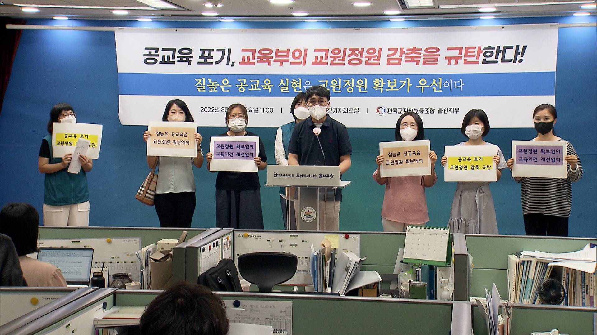 전교조 울산지부는 오늘(8/11) 울산시교육청에서 기자회견을 갖고 2023년도 교육부의 교원 정원 감축 계획을 규탄하며 전면 재검토를 요구했습니다.