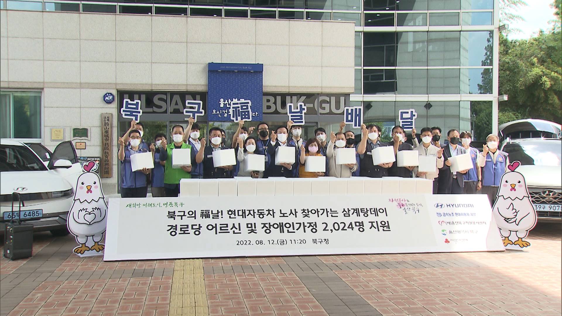 오는 15일 말복을 앞두고 현대자동차 노사는 오늘(8/12) 북구청 광장에서 지역 어르신에게 제공할 삼계탕 전달식을 가졌습니다.