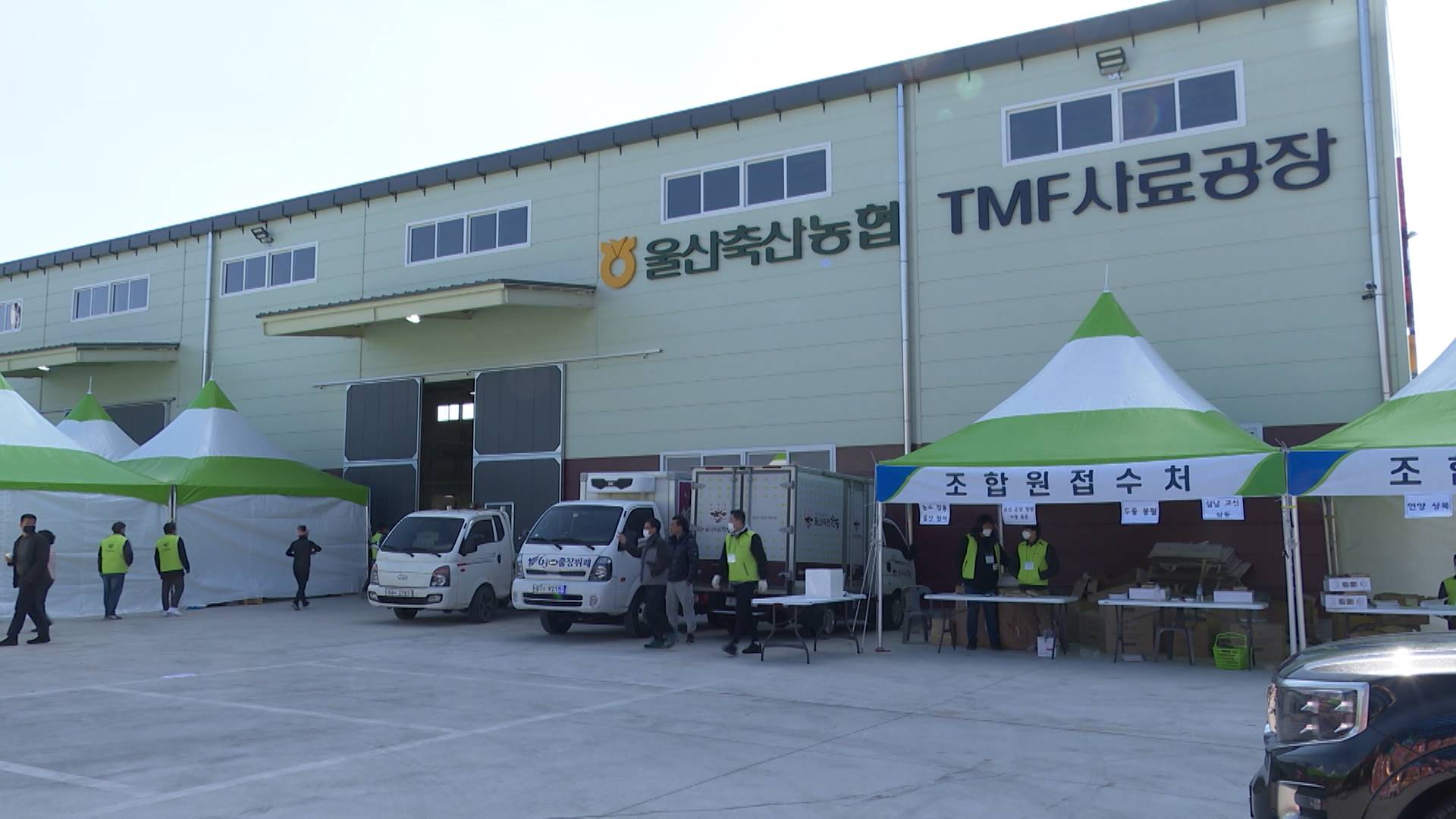 축협은 울주군 두서면 KCC 산단 내 1만여 제곱미터 부지에 초식 가축용 섬유질 배합사료를 하루에 130톤 생산할 수 있는 설비를 완공했다고 밝혔습니다.