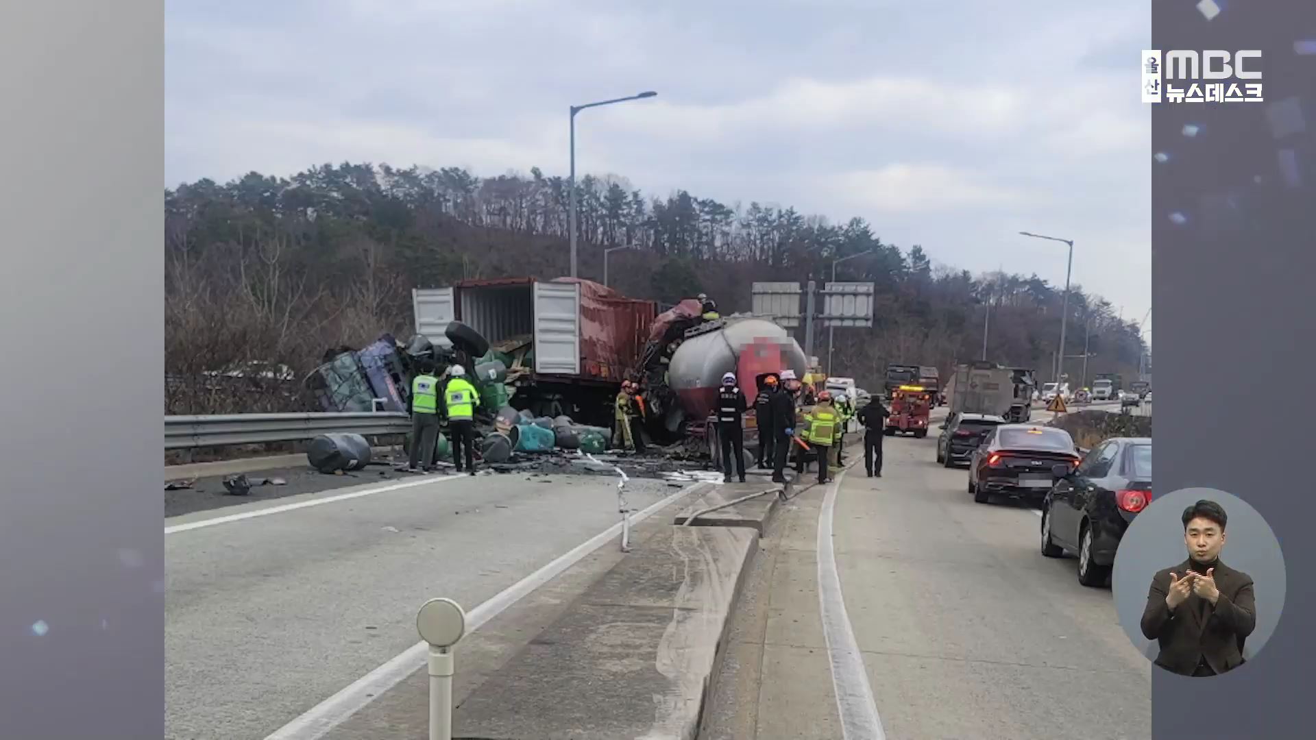 경찰은 탱크로리 차량이 연석을 넘어가 반대 차선의 트레일러와 부딪힌 것으로 보고 정확한 사고 경위를 조사하고 있습니다.
