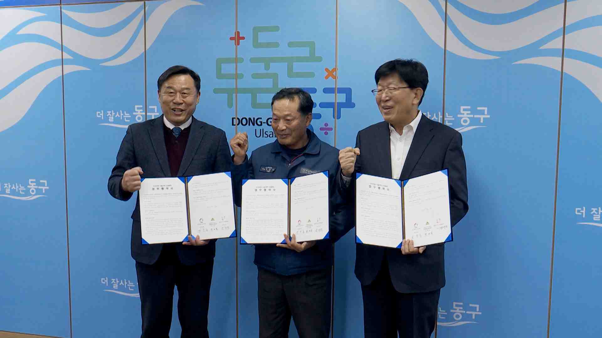 울산동구청이 현대미포조선 협력사, 동구시니어클럽과 조선 산업 기술인력 수급 협력' 협약을 맺었습니다.