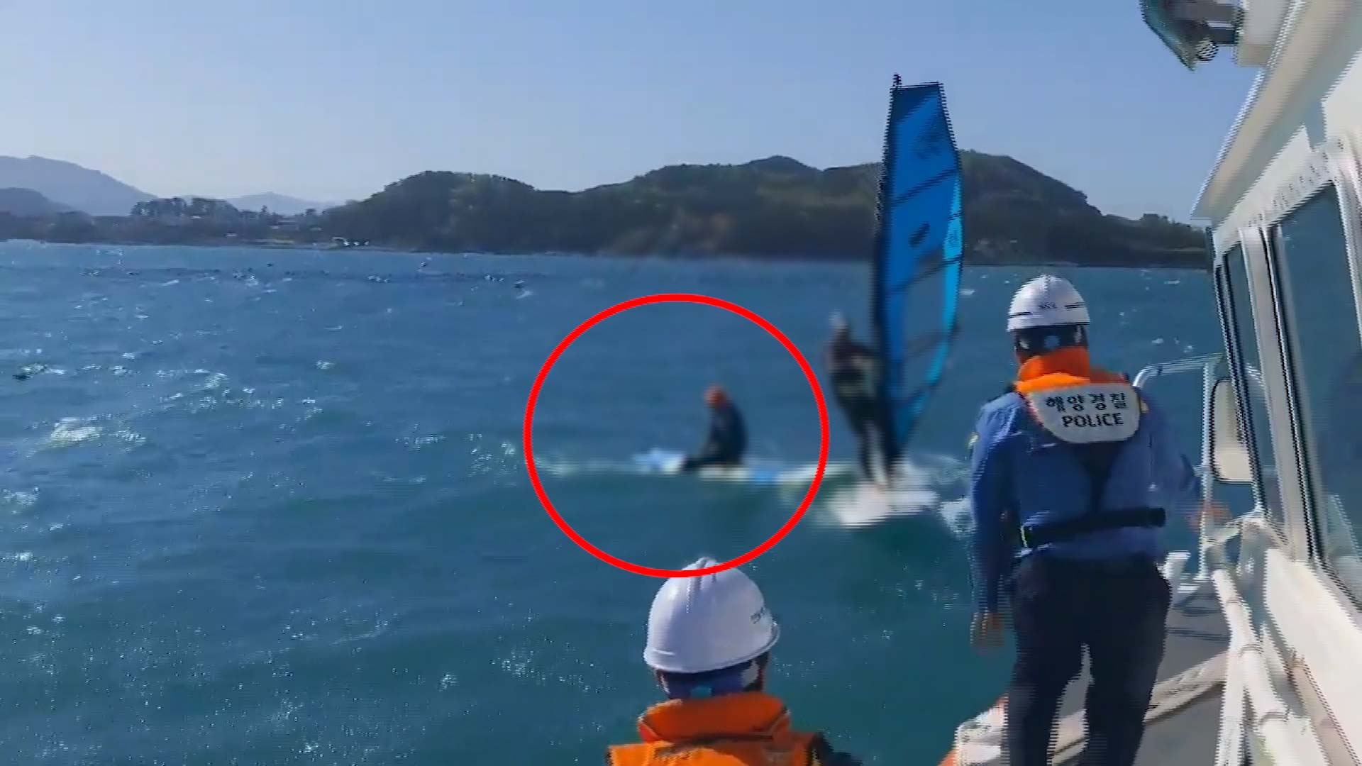 구조된 A씨는 윈드서핑을 하던 중 강한 바람에 윈드서핑 세일이 부러져 양식장 어장 줄을 붙잡고 버티고 있다가, 신고를 받고 출동한 해경에 구조됐습니다.//