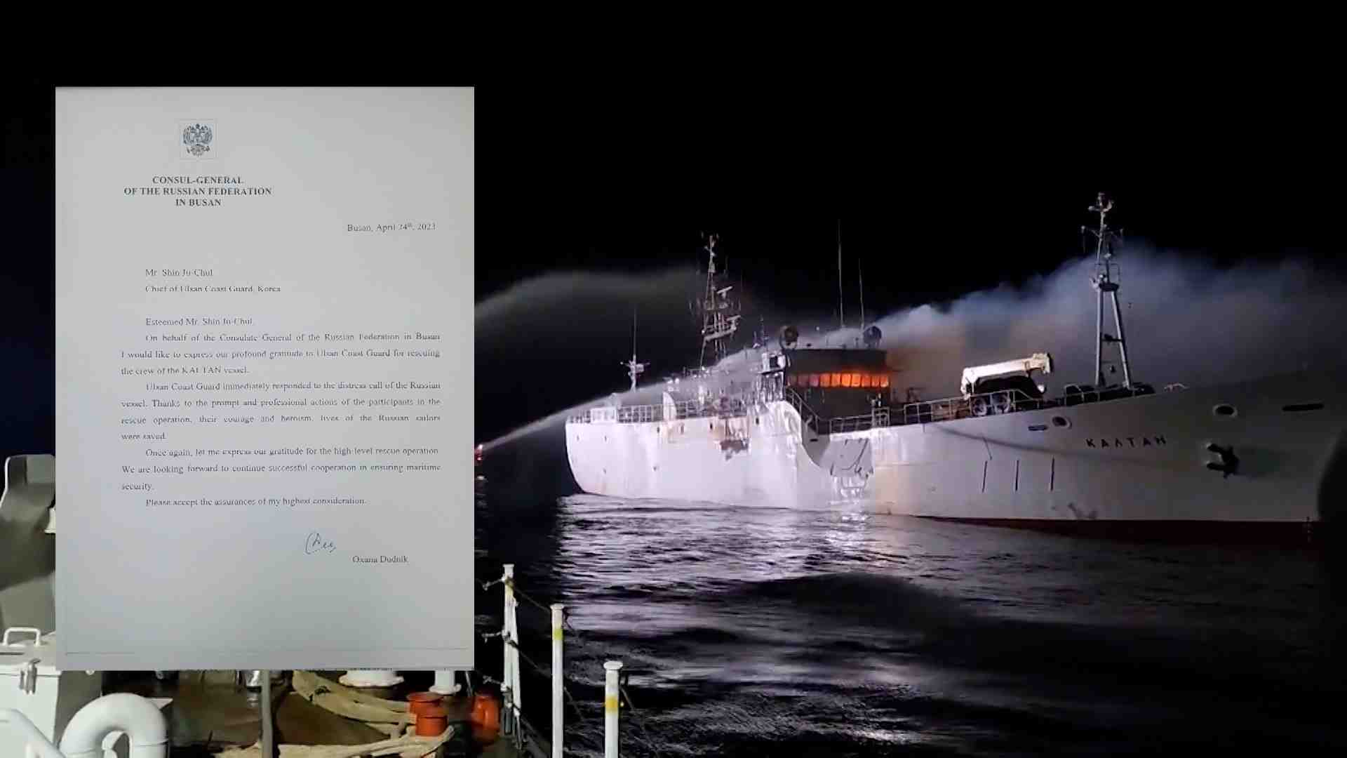 주 부산 러시아 총영사관이 지난 24일 발생한 러시아 어선 화재 진압에 앞장선 울산해양경찰서에 감사 서한문을 보내왔습니다.