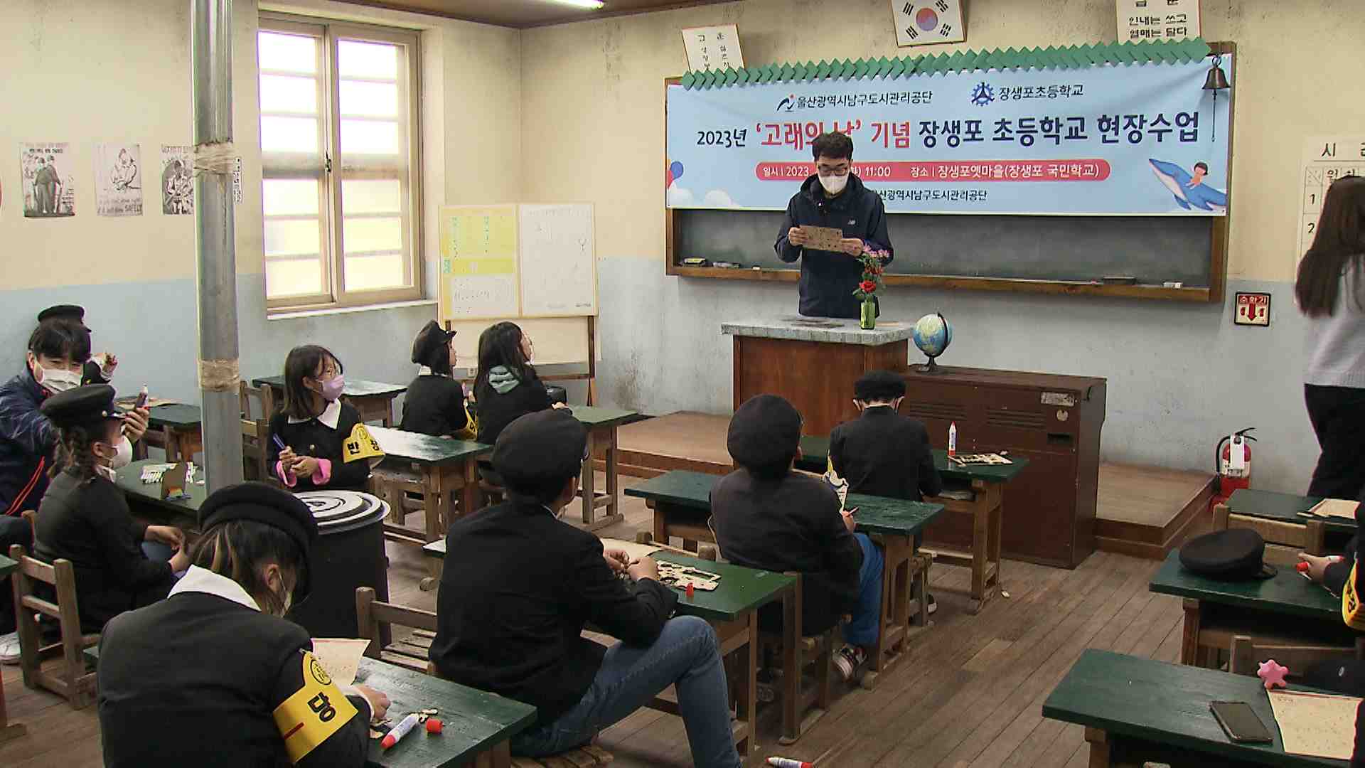 남구가 지정한 고래의 날을 맞아 장생포 초등학교 학생들이 장생포 문화마을에 마련된 60년대 국민학교 교실에서 현장 수업을 진행했습니다.