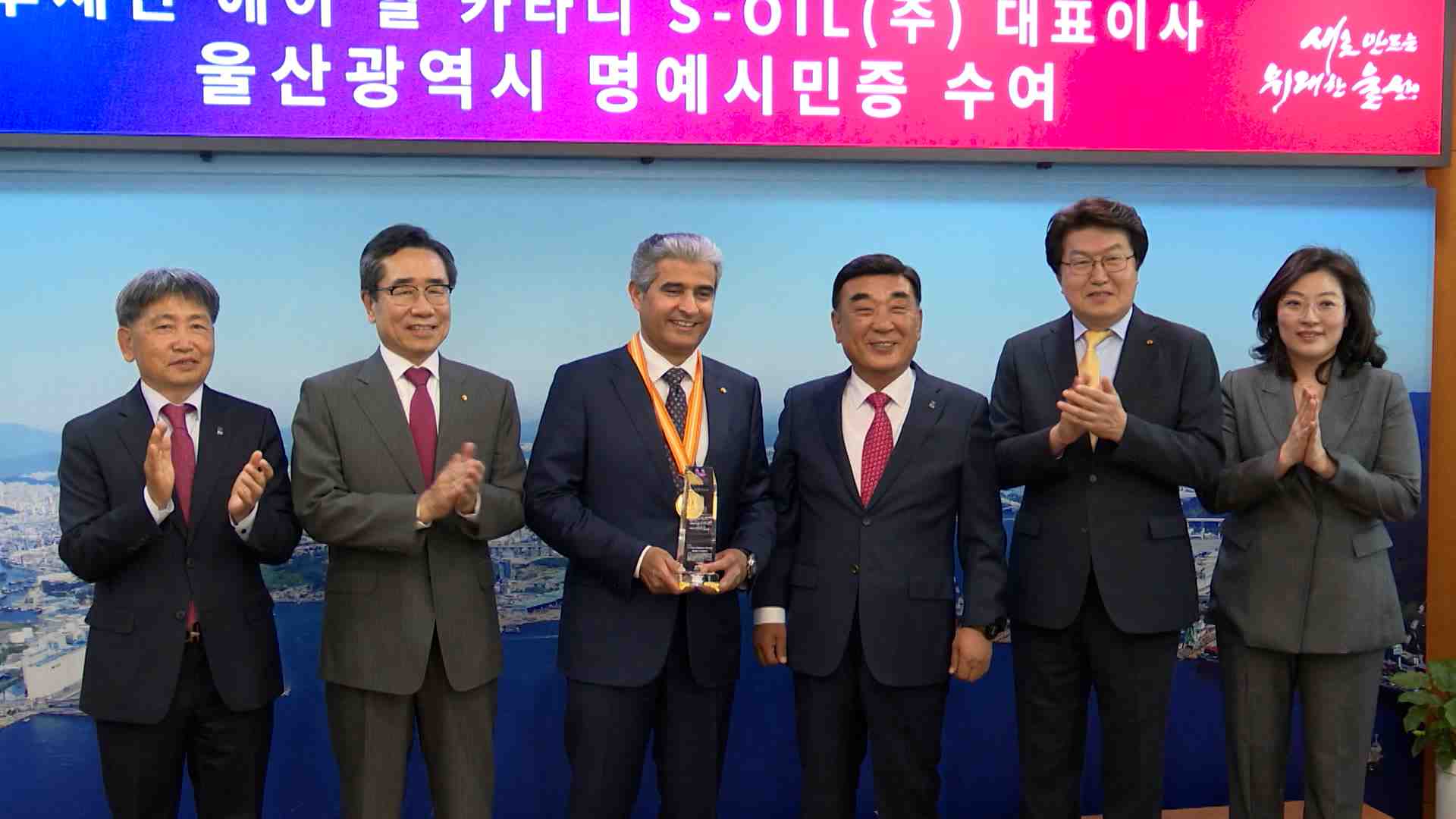 울산시는 오늘(4/26) 후세인 에이 알 카타니 에쓰오일 대표이사에게 명예시민증과 기념 메달을 수여했습니다.