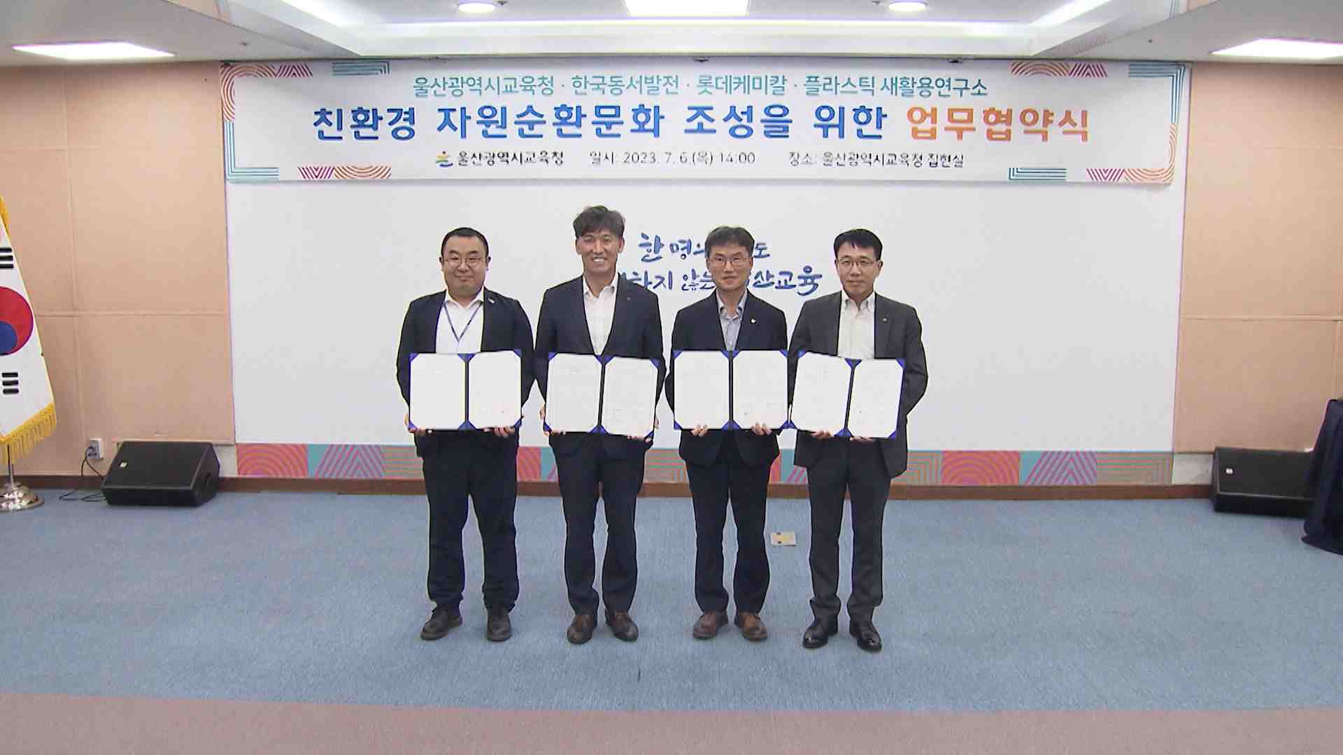 울산시교육청과 한국동서발전, 롯데케미칼, 플라스틱 새활용연구소가 오늘(7/6) 교육청에서 '친환경 자원순환 문화 조성을 위한 업무협약'을 체결했습니다.