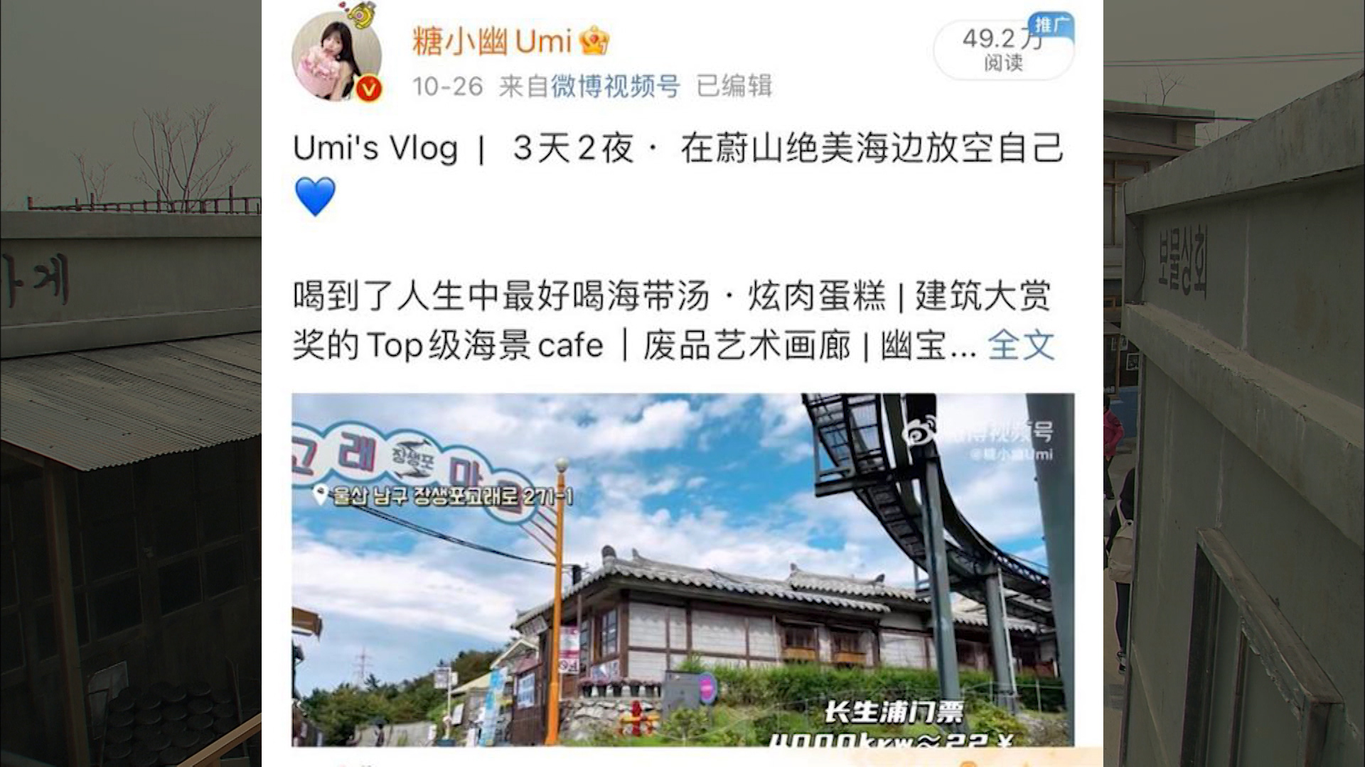 울산시는 지난달 중국판 SNS인 웨이보와 더우인에서 영향력 있는 3명을 초청해 장생포 고래문화마을, 강동 몽동해변, 성남동 젊음의거리 등을 소개하는 콘텐츠를 제작했습니다.