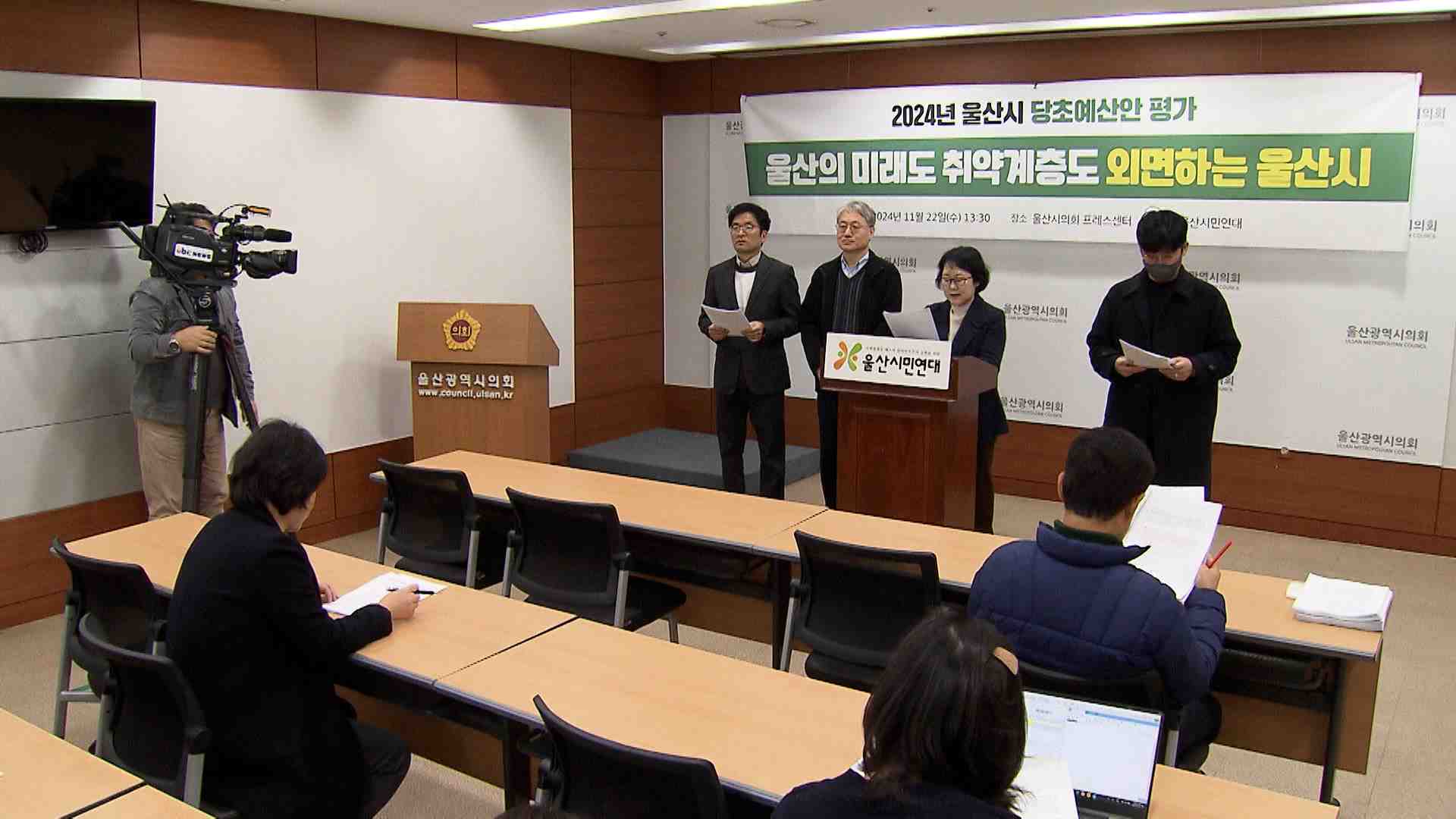 울산시민연대는 오늘(11/22) 울산시의회에서 기자회견을 갖고 2024년도 울산시 예산안이 목소리를 낼 수 없는 시민을 배제한 예산이라고 평가했습니다.