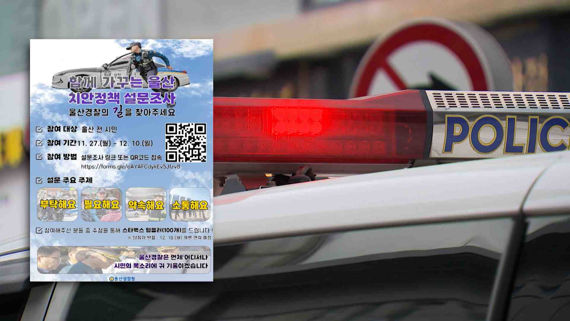 이번 설문조사는 울산경찰청 홈페이지를 통해 참여할 수 있으며, 경찰은 조사에 참여한 시민 중 100명을 추첨해 기념품을 제공할 예정입니다.