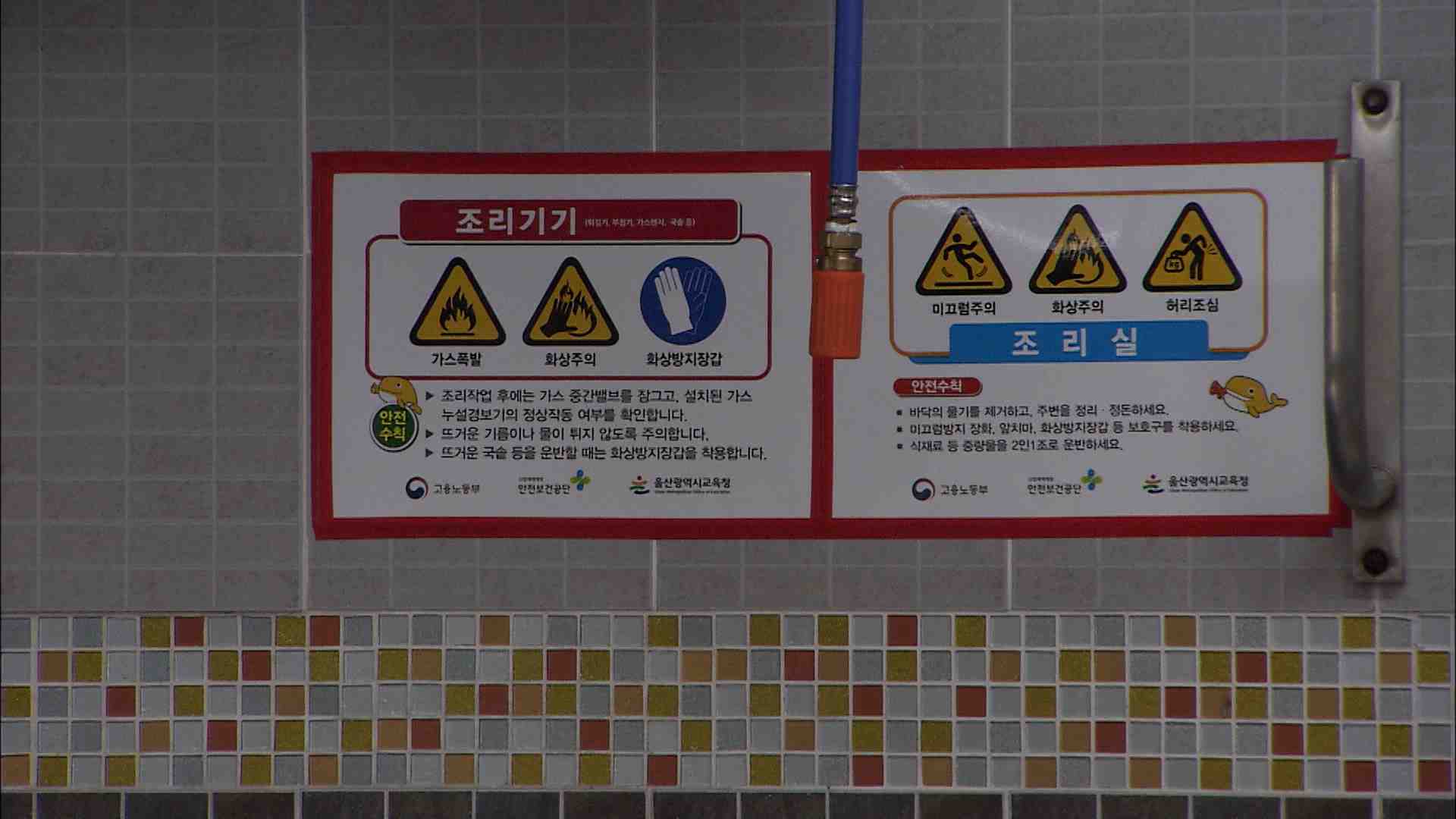 교육청은 지난 3월 전문기관에 산재 위험성 평가를 맡긴 결과 학교마다 5건에서 12건이 지적됐는데 경사로 미끄럼 방지 시설 설치와 밸브 화상주의 표지판 부착, 손잡이 있는 도마 사용 등이 많았습니다.