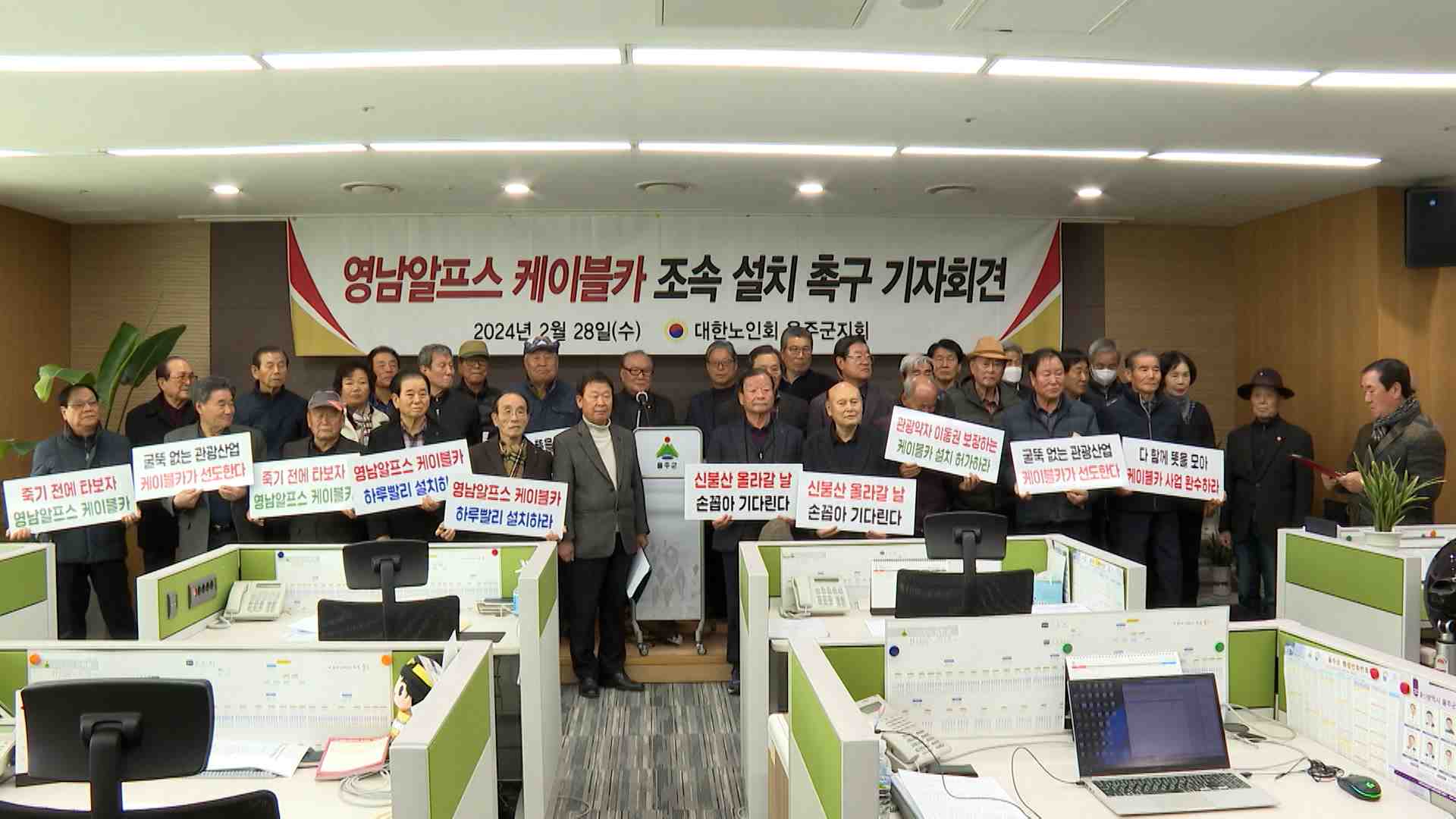 대한노인회 울주군지회는 오늘(2/28) 울주군청에서 프레스센터에서 기자회견을 갖고 교통약자들의 이동권 보장을 위해 영남알프스 케이블카 사업의 조속한 이행을 촉구했습니다.